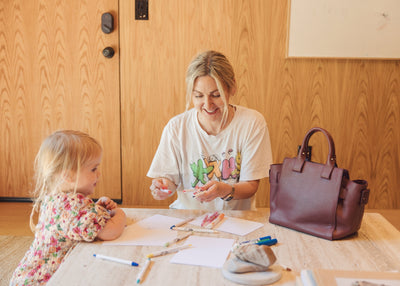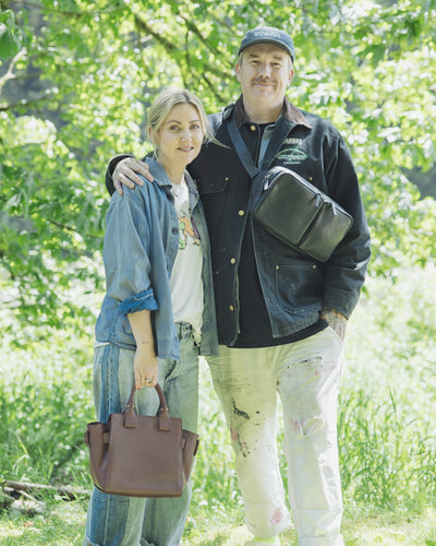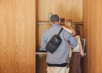 Lee wears the Roadster Tri-Zip Crossbody in Dark Indigo, made from durable vintage-wax leather—a slightly rugged yet elevated piece that keeps both hands free (often a welcome bonus for parents of young kids!).