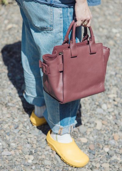 Karie wears her Editor Bloom Tote in Bordeaux, a refined piece with unique ruffled folds, balanced with a surprisingly spacious interior that suits both the city and weekends at the cabin. "The color and scale is so chic, and it's a good 'mom bag' while looking much more elevated," Karie notes.
