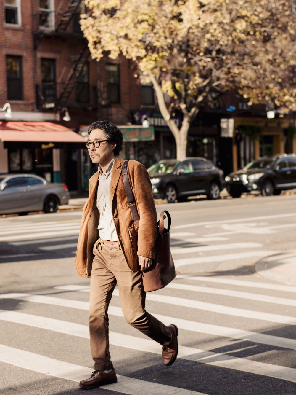 Kenzo Minami with his Tone Nume Box Tote at Mast Books, one of his favorite bookstores, a place full of chance encounters with new ideas.