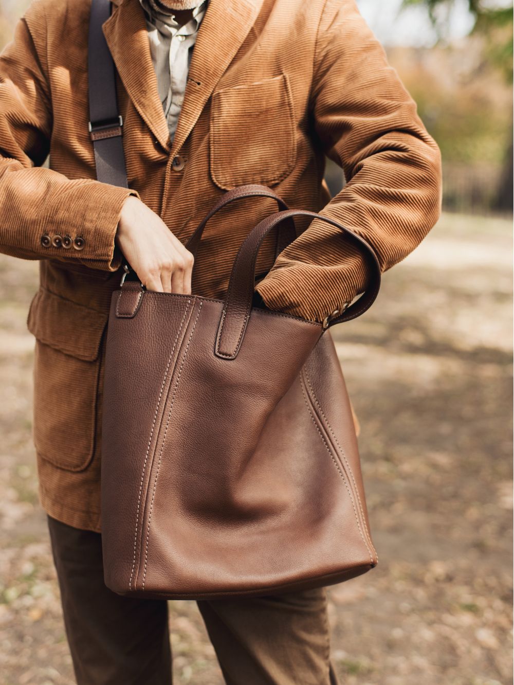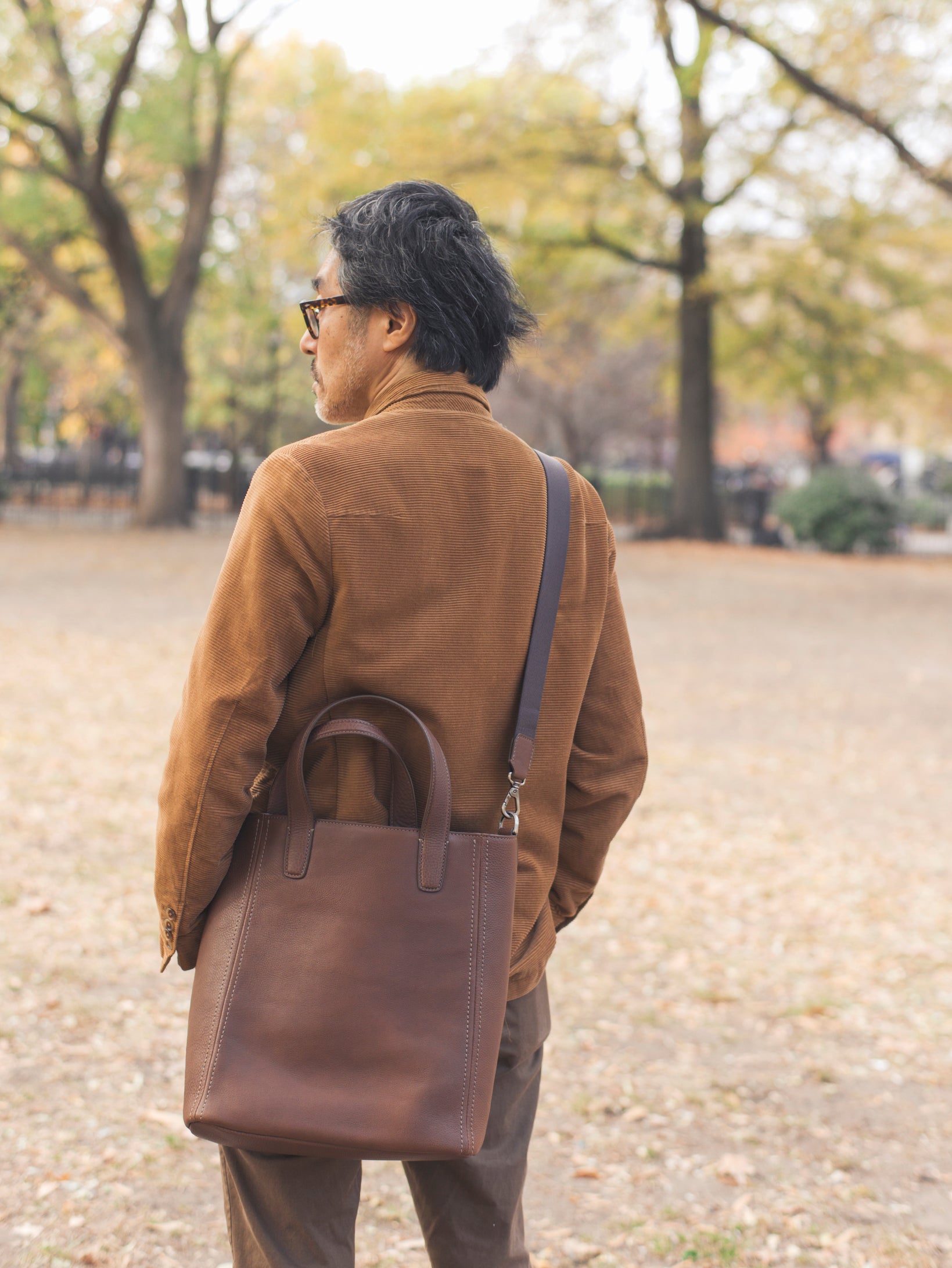 The timeless quality is, of course, part of why Kenzo chose our classic Tone Nume Box Tote—also for its versatility, the way it deepens in character as it ages, and “because I am always doing a lot with my hands and I need them to be free … I stick my books, sketch books, note books, pens, and whatever else in it to stroll, go to the park, or grocery shopping.”