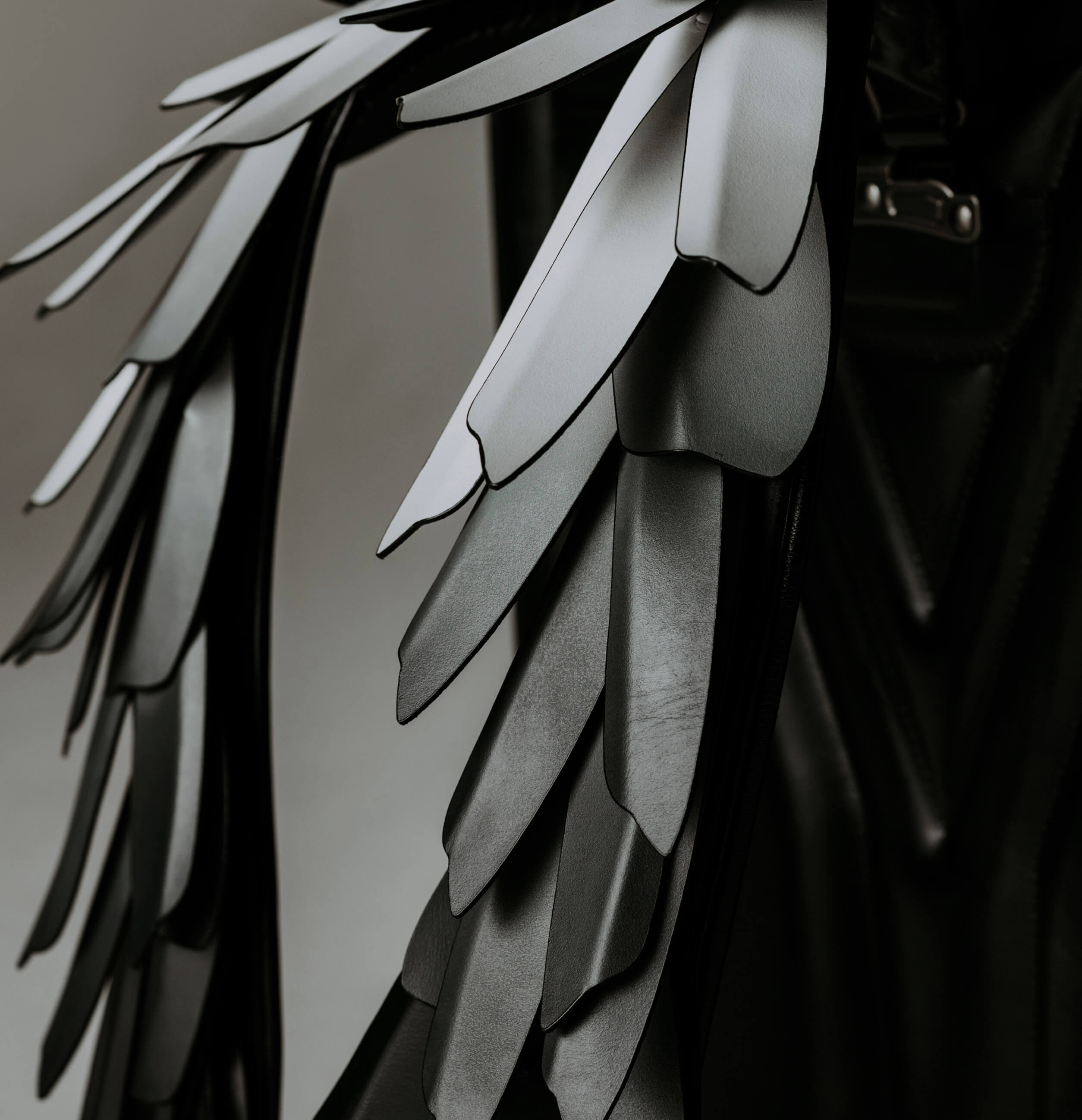 The S-shaped, feathered shoulder straps draw inspiration from the decorative elements of Tanahashi’s entrance robes. Crafted entirely from leather, each feather is individually folded to evoke real plumage, and finished with unique gradient coloring and meticulous edgework.