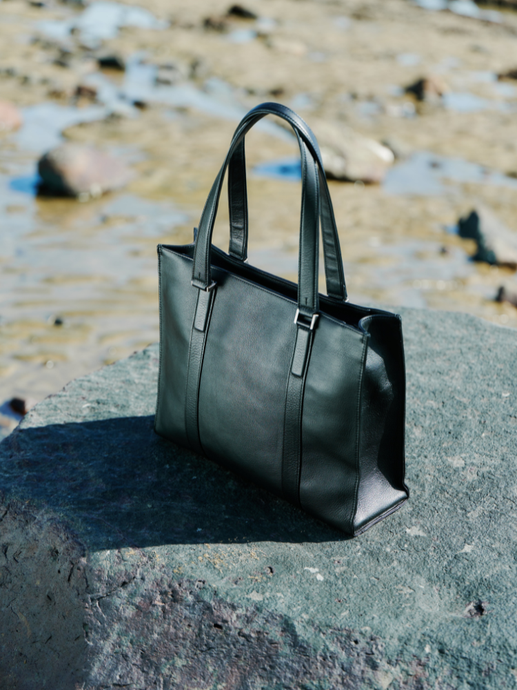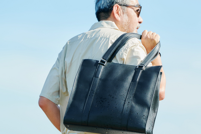 With its structured silhouette and studded base, the bag stands upright when set down—letting him free his hands as he pauses to admire the horizon. Whether for a beachside walk or a daily commute, the Square Tote blends function with minimalist elegance.