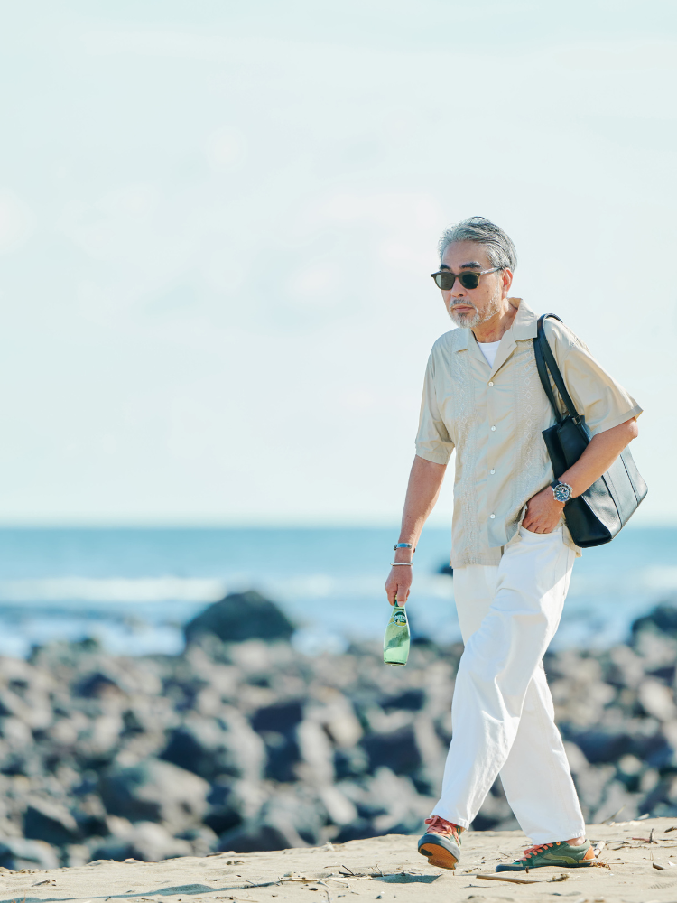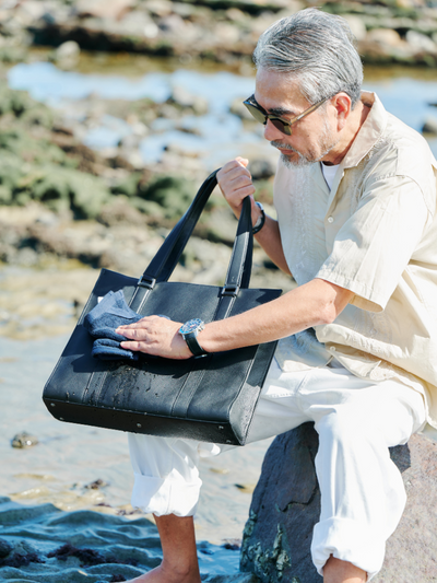 Later, Tony heads seaside with his Ame Waterproof Square Tote, strolling barefoot through wet sand and sea foam. A former yacht designer, solo trips to the ocean still ground him. As he takes in the scenery, occasional splashes hit his skin—but his tote keeps everything dry.