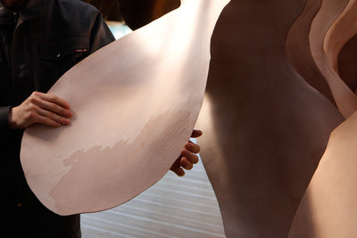 Once fatliquoring is complete, the craftsmen use a scraper and warm water to stretch the leather further. Though simple at a glance, this is a highly demanding task that requires careful pressure control and a fine-tuned touch that greatly influences the final result.