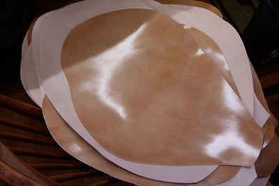 As we enter the workshop, we first see the tanned cordovan hides that have been drying and aging for about two months. The next step for these hides is fatliquoring—the process of working oil back into the dried, tanned leather. This revives the fibers and restores softness and flexibility.