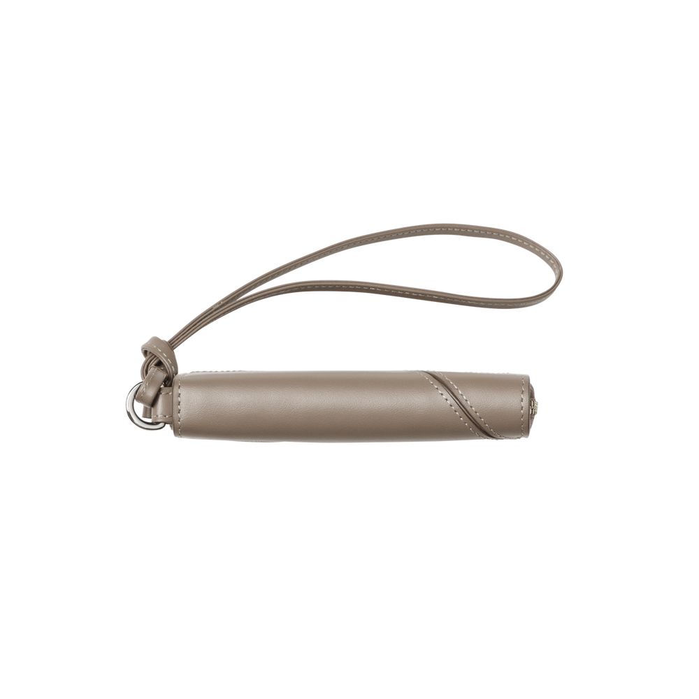 - Long leather strap can attach to bags or be worn on the wrist