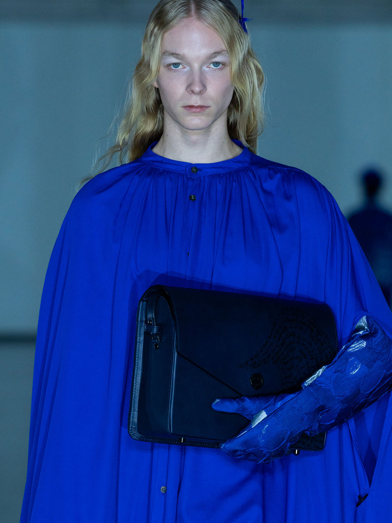 Known for exploring the theme of “picturesque scenery,” SHINYAKOZUKA’s collections often draw from designer Shinya Kozuka’s own drawings and paintings. The latest season (ISSUE#7) tells the story of a penguin who, though yearning for the freedom of flight, has ultimately embraced life as a penguin. Crafted from luxuriously smooth leather and finished with a wax seal–inspired button, it’s an exquisite, one-of-a-kind piece where whimsy meets masterful craftsmanship.