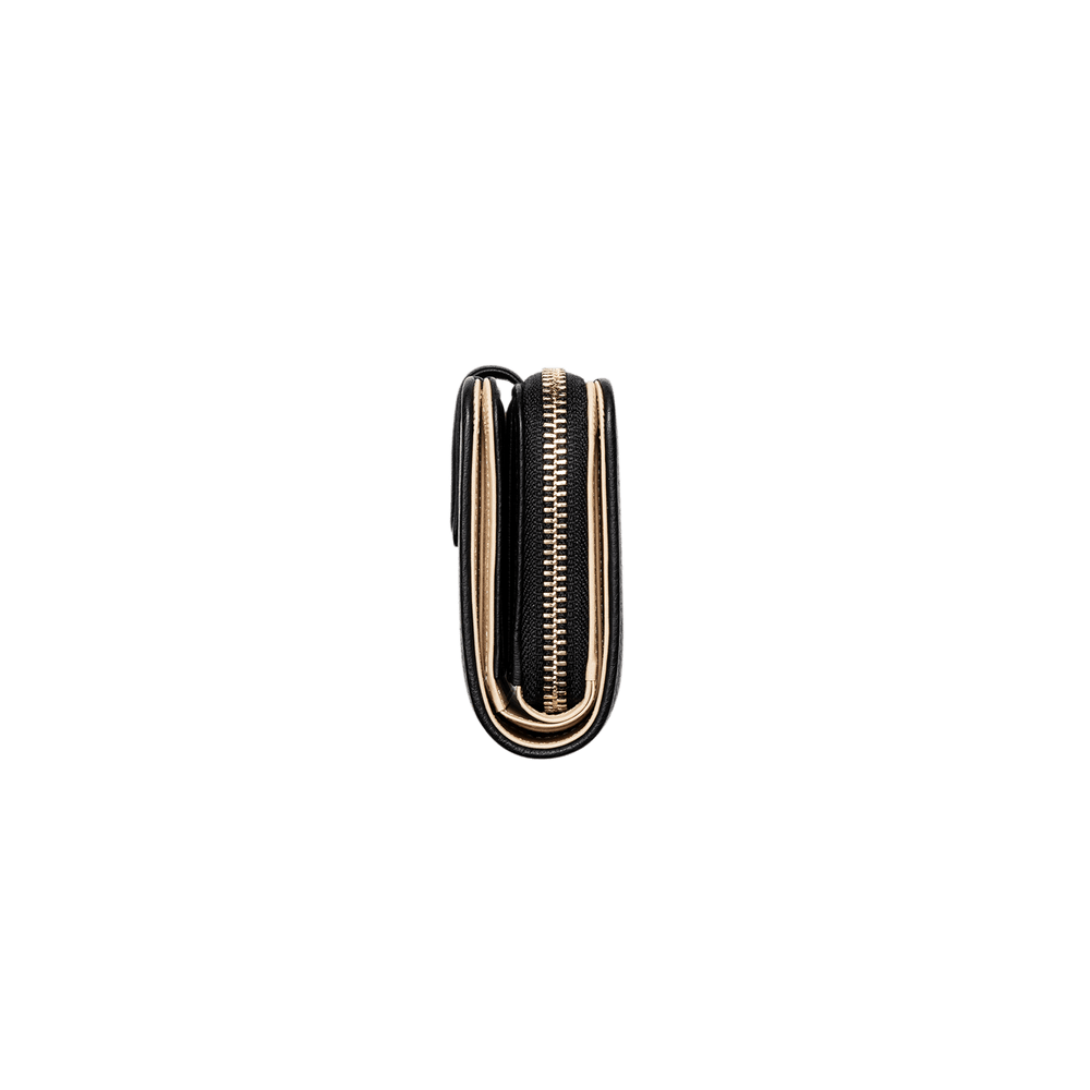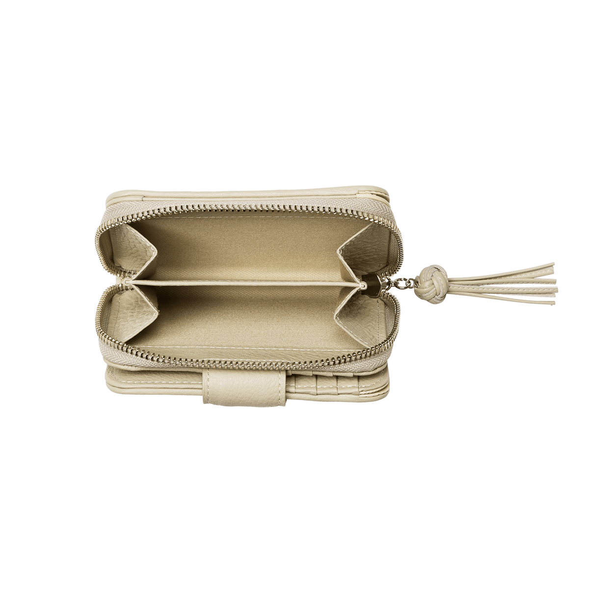 - Partitioned coin compartment with a zipper that opens along 3 sides