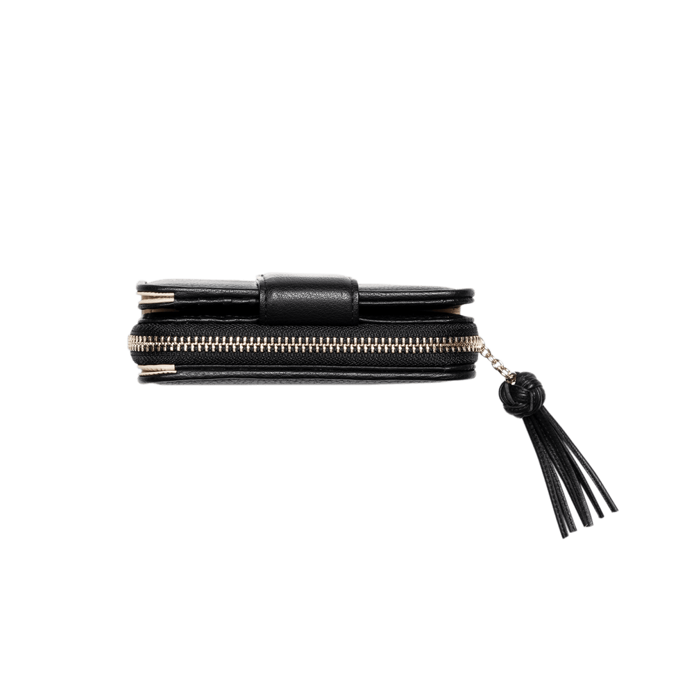 This chic bifold wallet is crafted from soft leather and adorned with a sturdy flap fastener for everyday use. The wallet comes with eight card slots, and the zippered coin compartment is partitioned, making it easy to keep coins organized. Make this wallet your favorite accessory and enjoy the leather tassel that sways gently whenever you take it out.