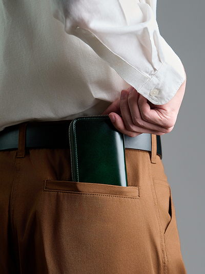 The compact size makes it easy to carry and slip into a pocket. It can also double as a wallet if you need to run out for a moment, making it very suitable for the modern cashless lifestyle. Exquisite cordovan leather, which carries the title of the king of leather, was selected as the material. As time goes by, the leather's luster will eventually develop into a jewel-like sheen. An elegant case that is both functional and modern, this is a product that you won’t want to let go of once it’s in your hand.