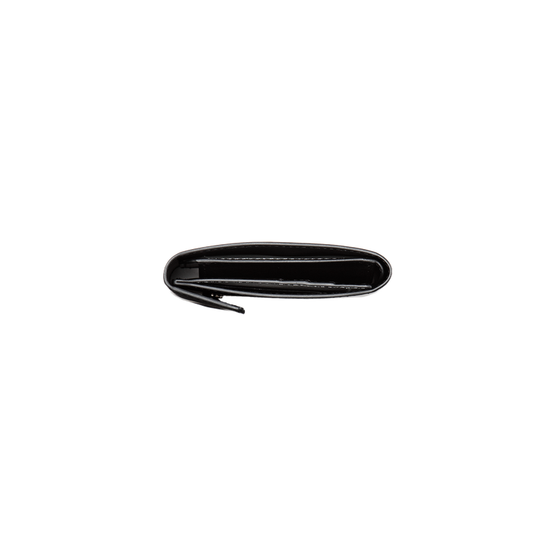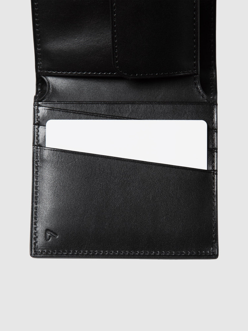 The design is a break from traditional bulky wallets, keeping its slim profile even with the snap-fastened coin compartment inside. The black vegetable-tanned leather creates a visual sense of understated elegance and leaves a deep impression on others. The banknote compartment has a unique asymmetrical design with an L-shaped opening that facilitates access to bills. A single card slot is tucked within the banknote compartment while three additional slanted card slots for frequently used cards are on the other side, making this a go-to wallet for today's cashless society.- 1 card slot in the banknote compartment