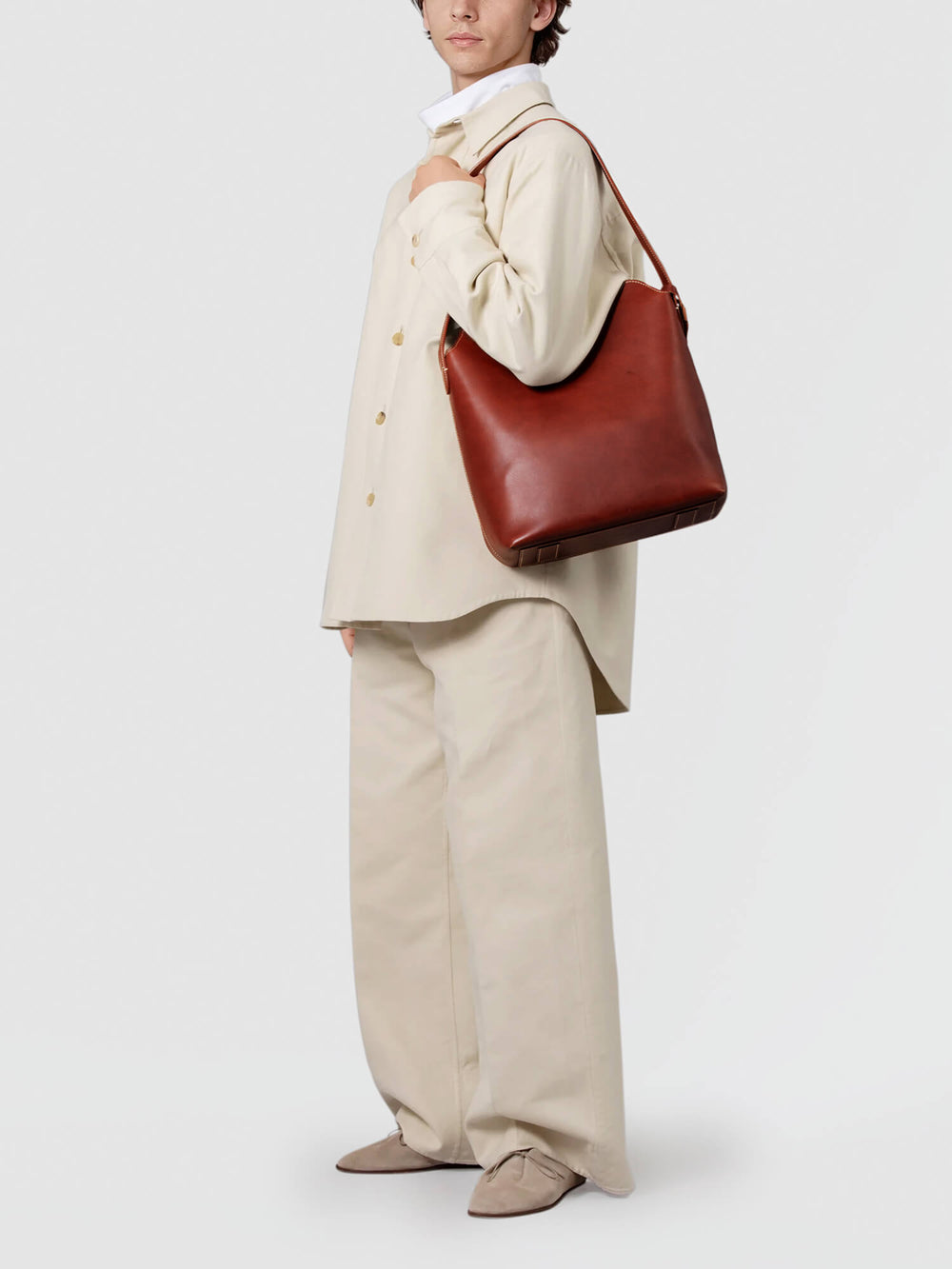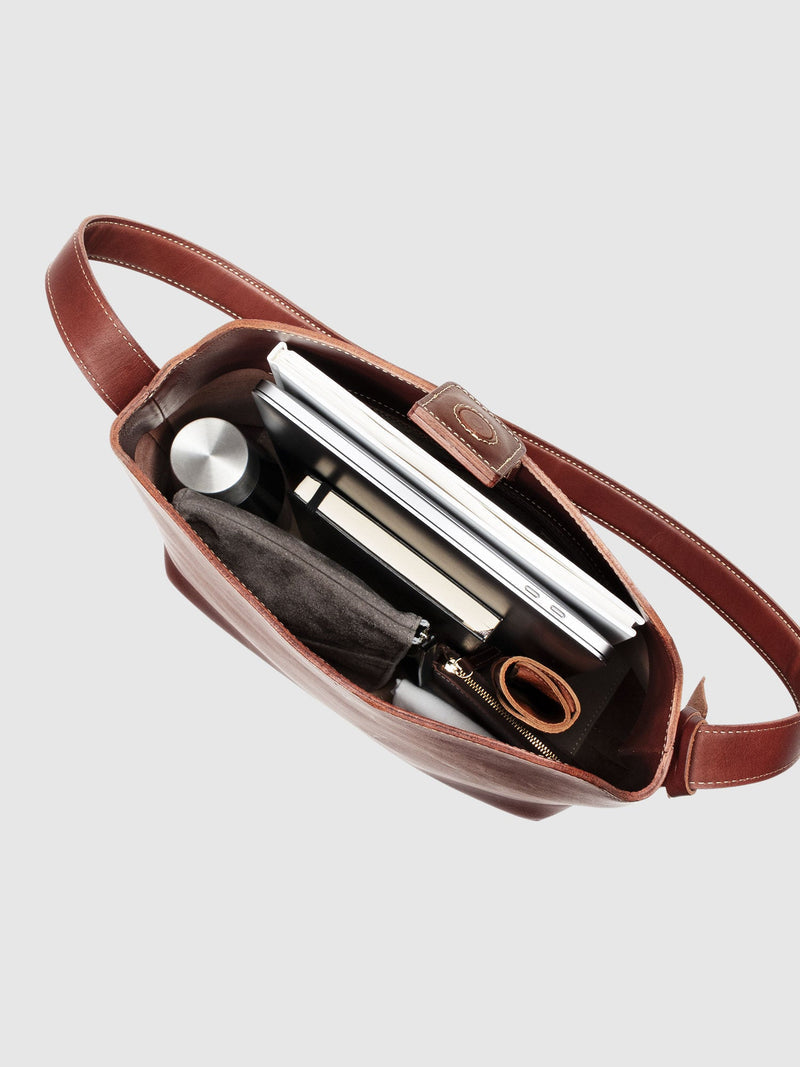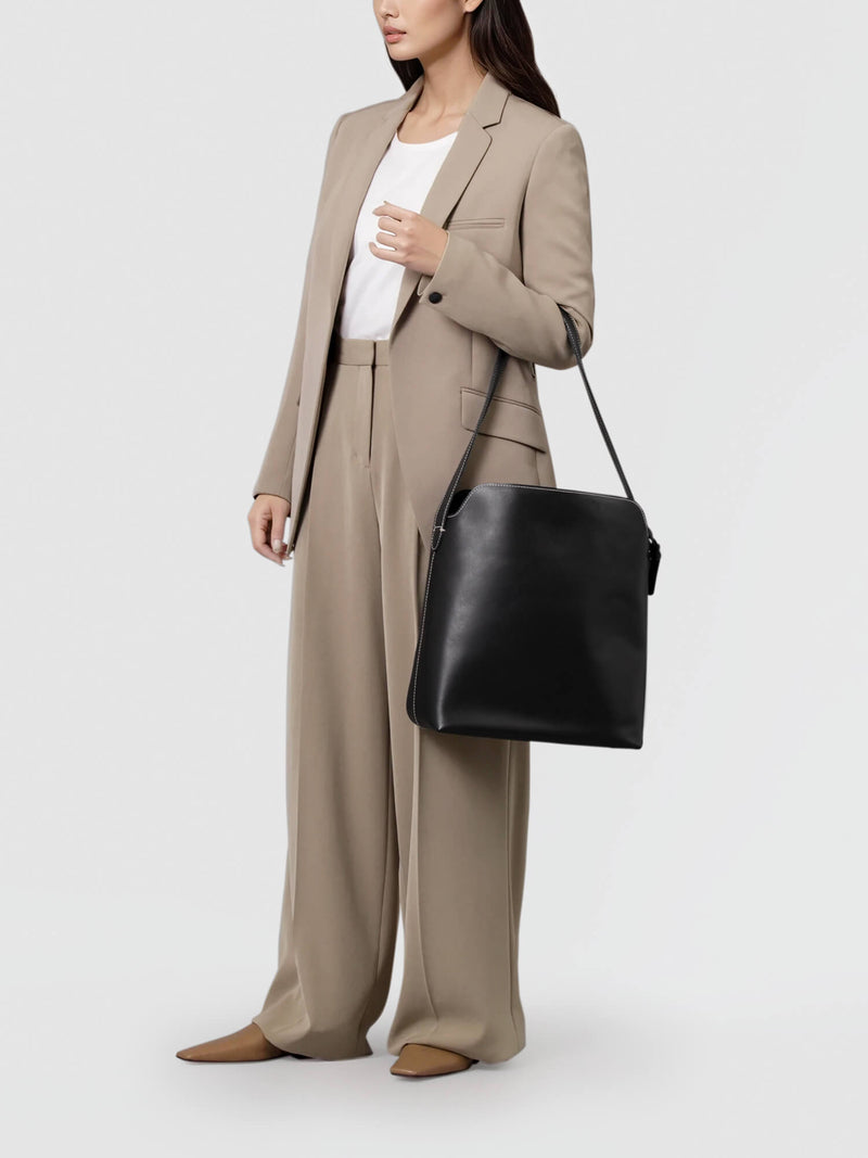 上質な牛革、ワンショルダーに一目惚れし、購入しました。容量も沢山入るのは良いですが、小柄な人にはサイズ感が大きく感じる為、少し浅めのサイズがあると良いと思います。