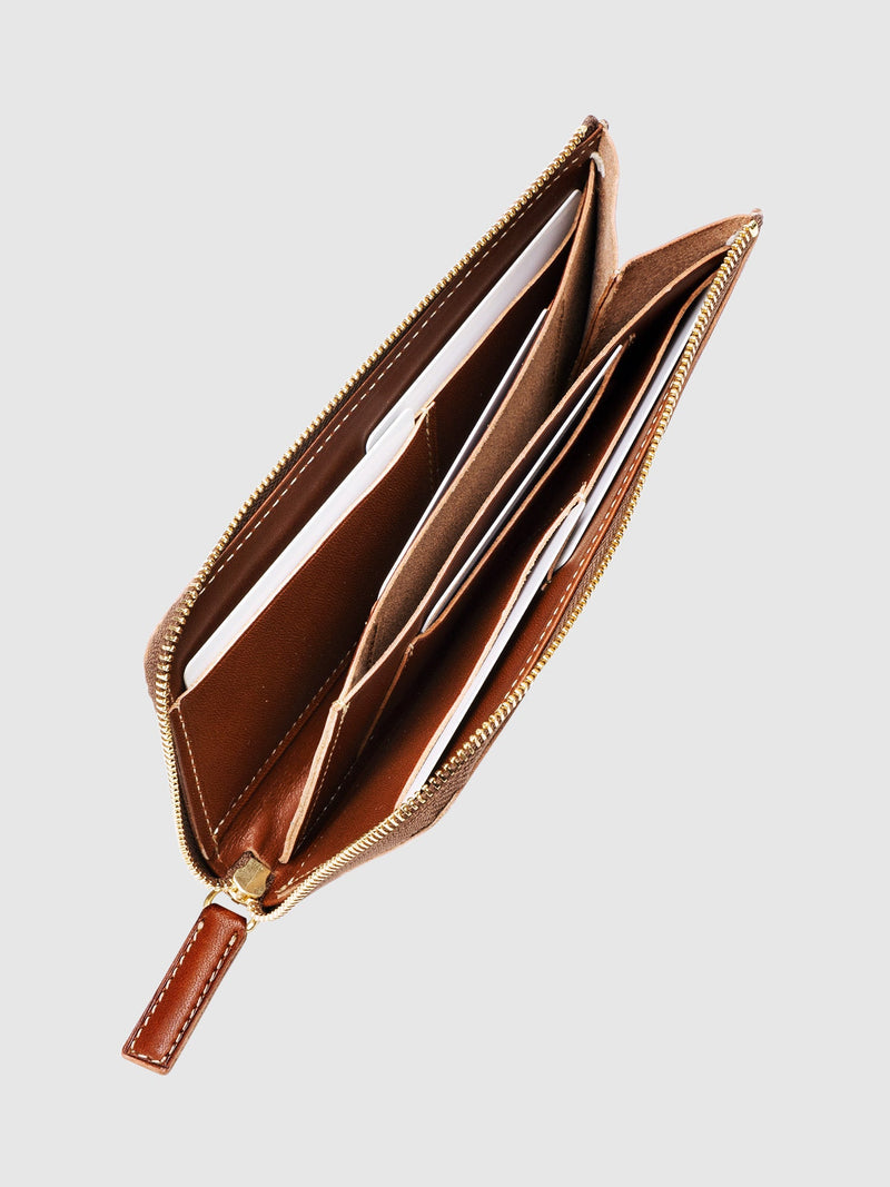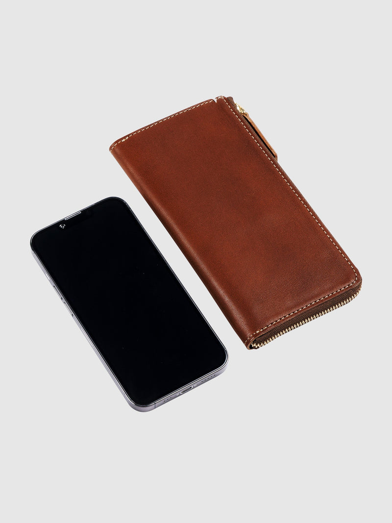 This minimalist, next-generation wallet features a slim, elegant profile that slips effortlessly into pockets and smaller bags. The L-shaped zipper offers both easy access and a contemporary edge—all without sacrificing the timeless appeal of a long wallet and quiet luxury of aging leather.Size & Details