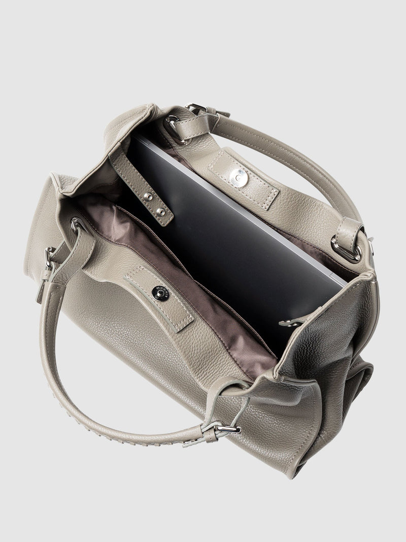 - Adjustable interior leather belt with a top hook to customize shape and capacity