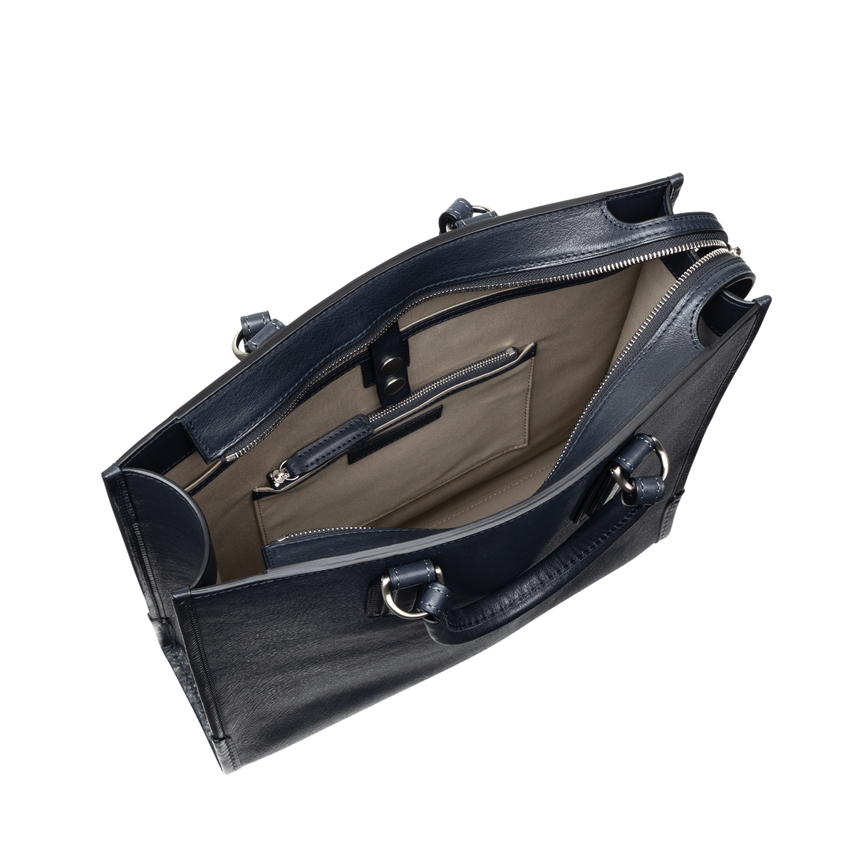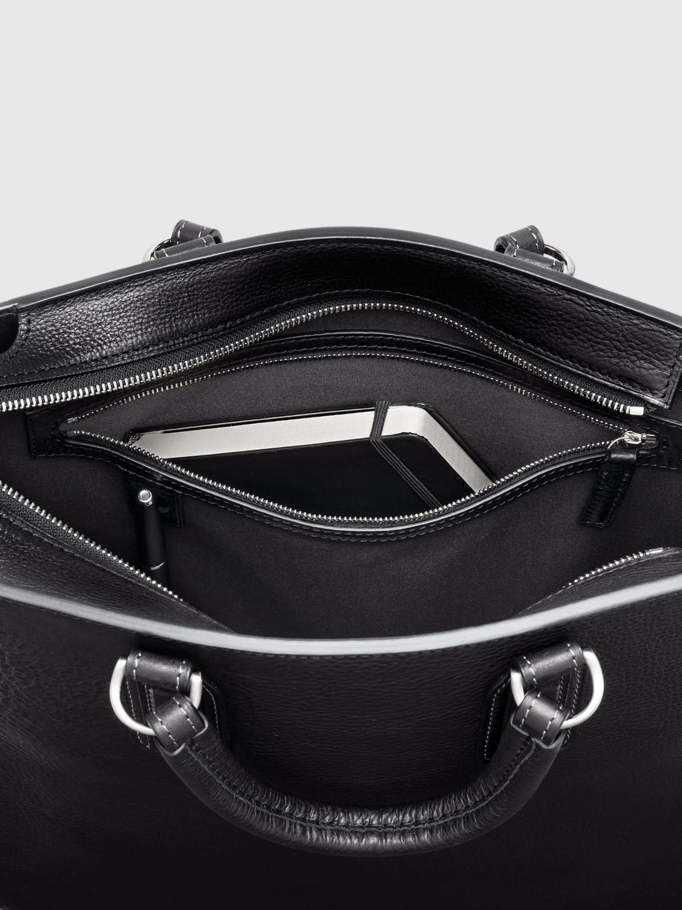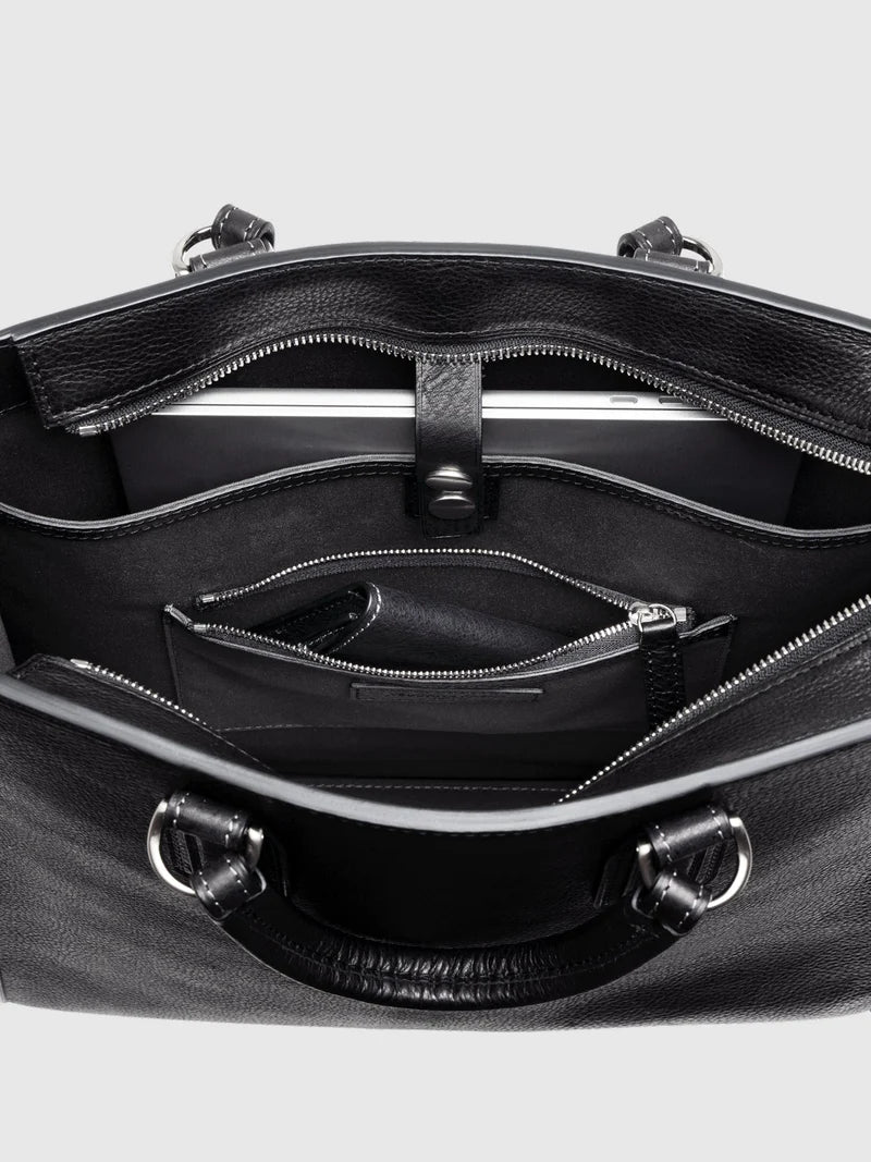 - Thoughtfully organized interior featuring a two-stage adjustable snap-closure document pocket, a smaller accessory pocket, a tablet-sized zipper pocket, and a dedicated pen loop