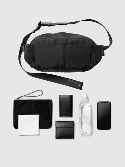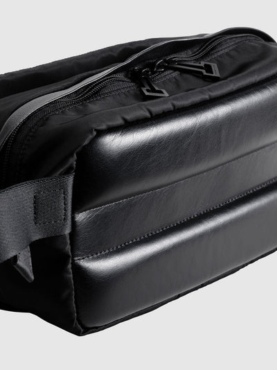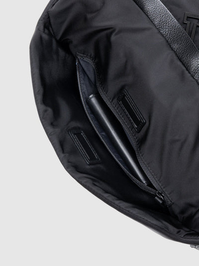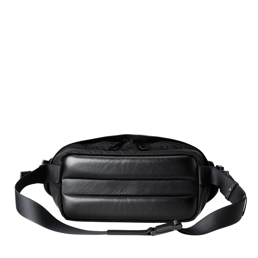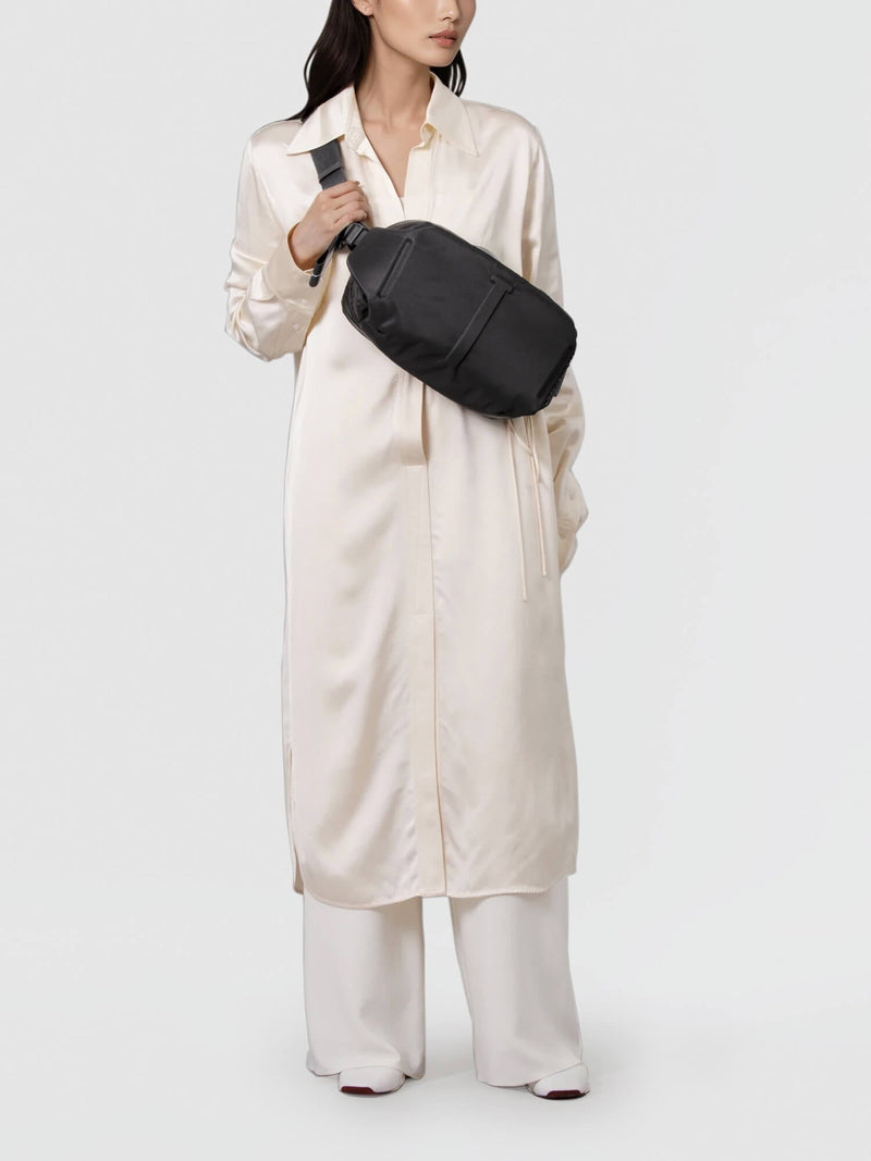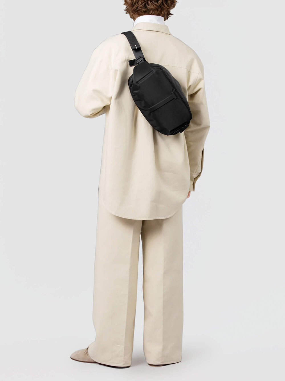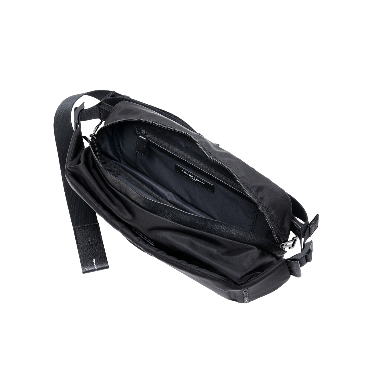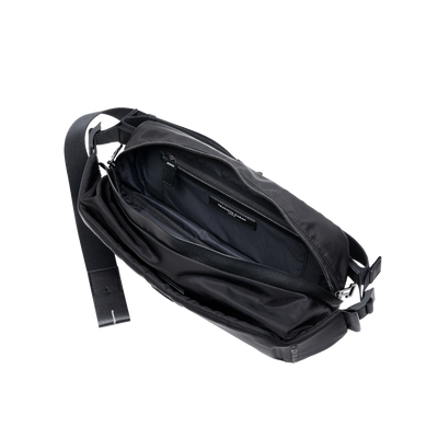Designed for ease and refinement, this lightweight crossbody is your ideal weekend companion. Its structured, architectural frame offers a sleek, modern silhouette with a spacious interior for all your essentials. Crafted from sustainably made, high-density Italian nylon, it blends luxury and durability, while its leather accents honor our 60 years of craftsmanship—and the next 60 ahead.- Spacious interior fits a 600ml (20oz) water bottle and an iPad mini