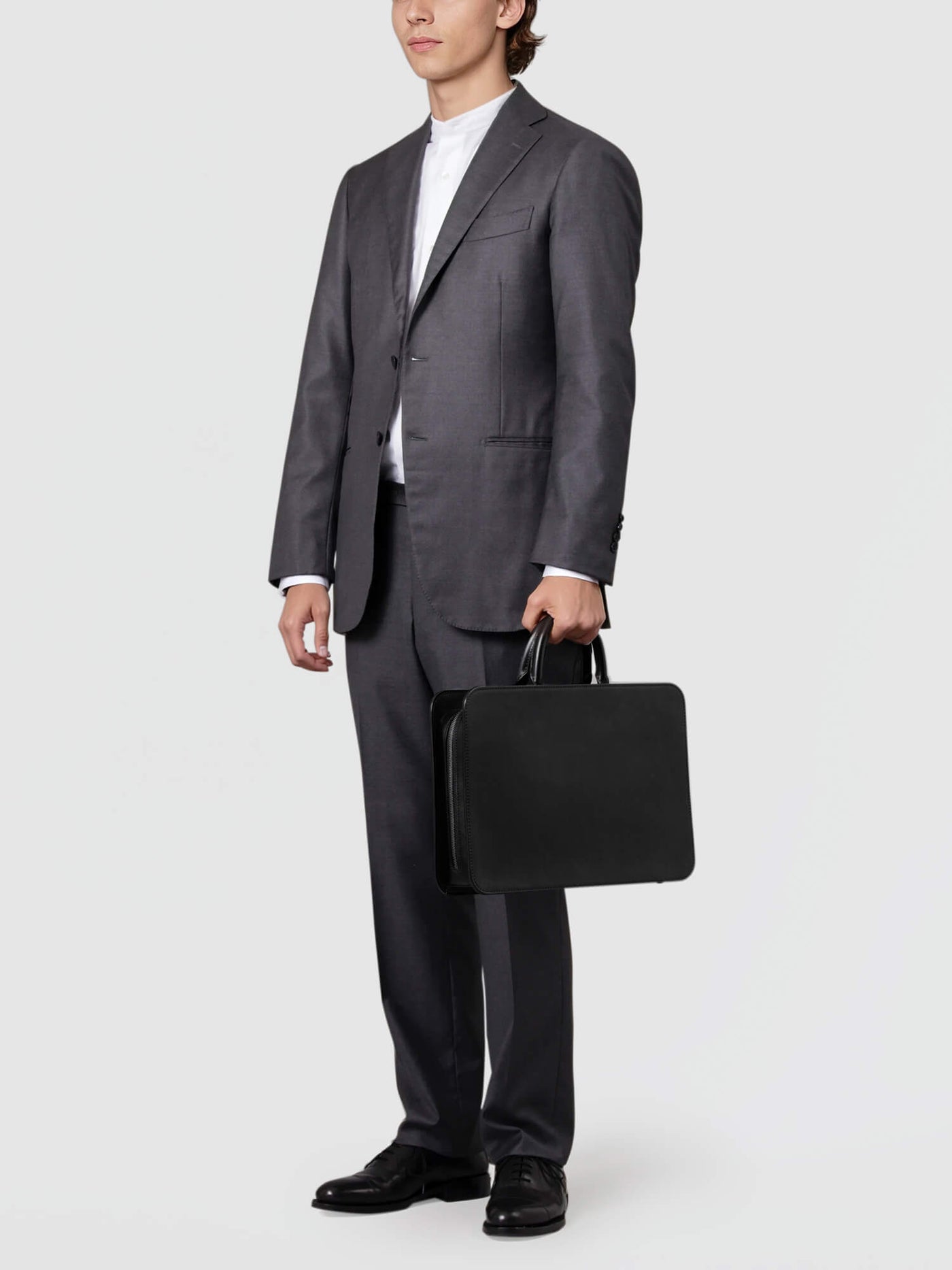 The deceptively simple design of this briefcase is accentuated by striking details that provide a sense of warm comfort. Made of sturdy vegetable-tanned leather, the bag's unique design encloses its contents between two planes of leather. The hidden handle attachments and lack of superfluous elements allow the smooth single piece of leather to stand out and create a highly distinctive minimalist profile. The combination of the solid black color and the natural texture of the leather results in a minimalist design that goes with any setting, making this practical briefcase your perfect everyday companion.- Accommodates a 13” laptop