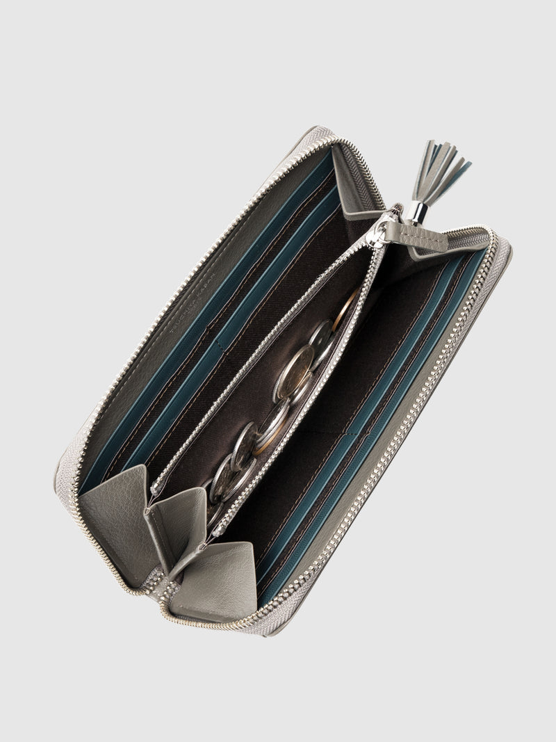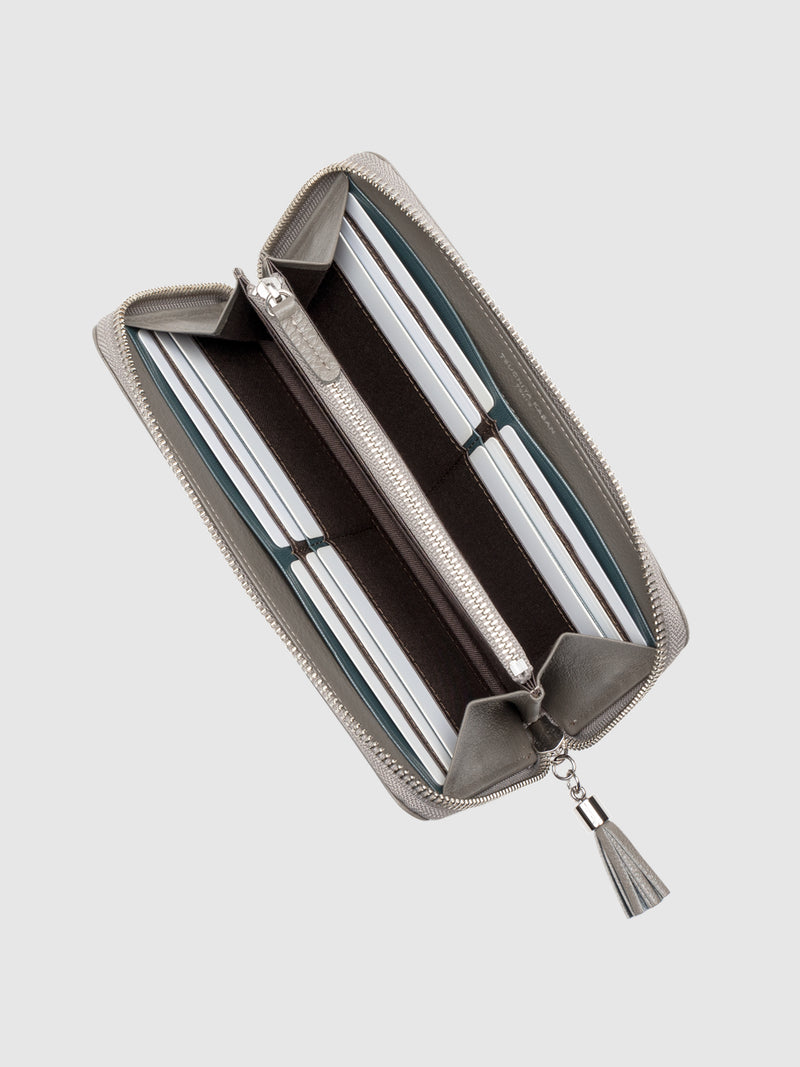 「アッシュグレー」を購入しました。皮の手触り、質感が最高で、使い勝手も良いです。カード枚数が多く入るのでその点も大満足です。小銭入れは別持ちをしているため、真ん中のファスナー部分はメモやポチ袋などを入れています。以前はボッテガヴェネタを使っていましたが、これからはこちらの製品を続けて使いたいと思います。