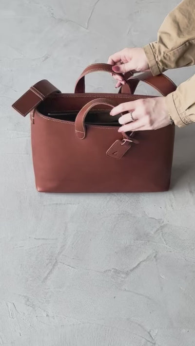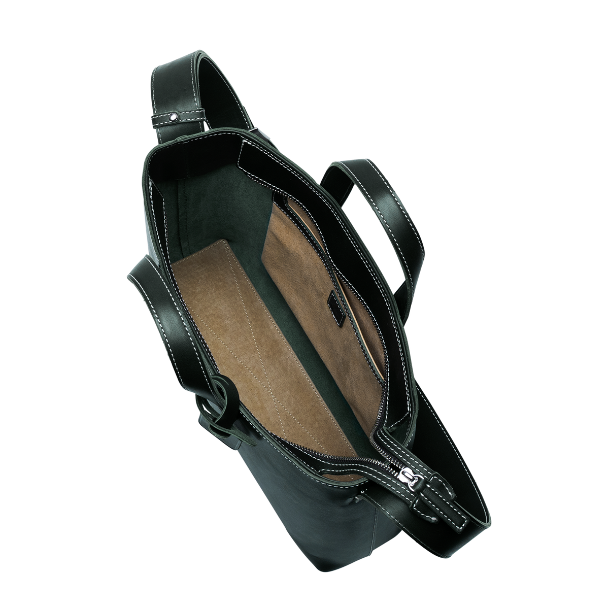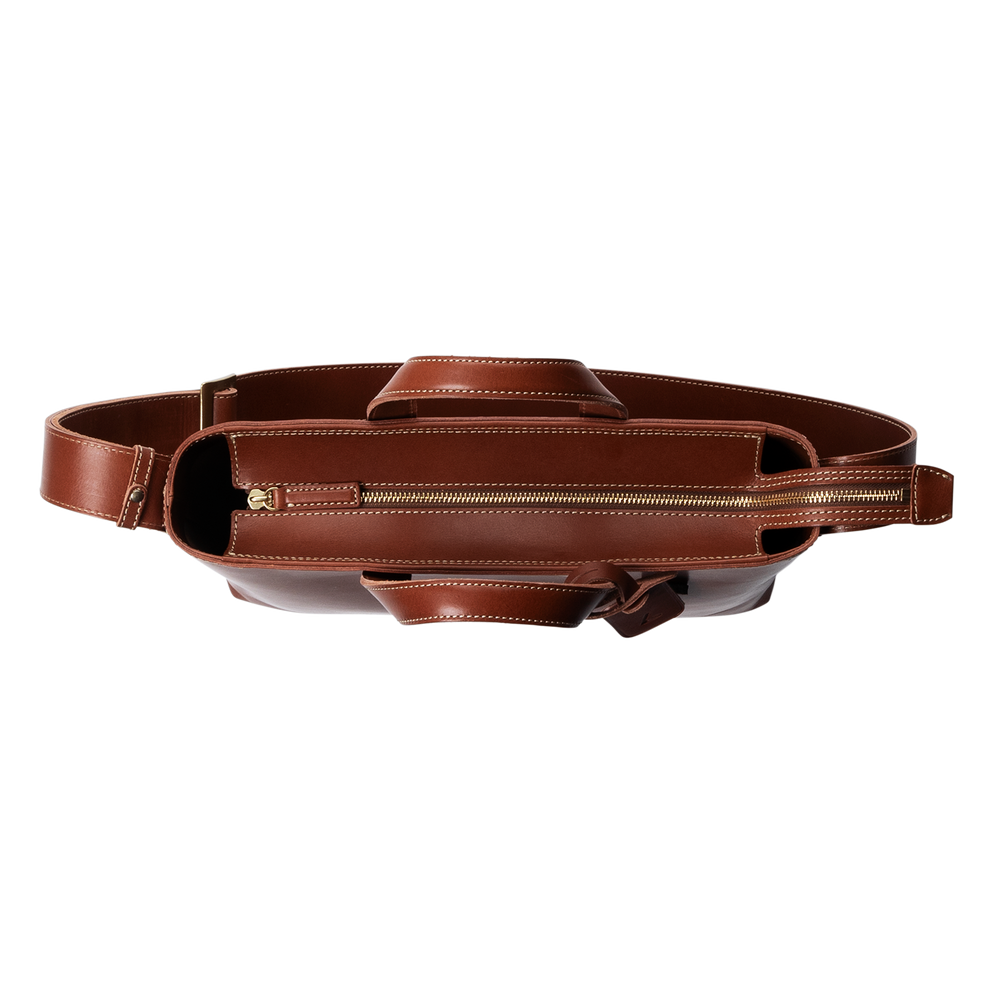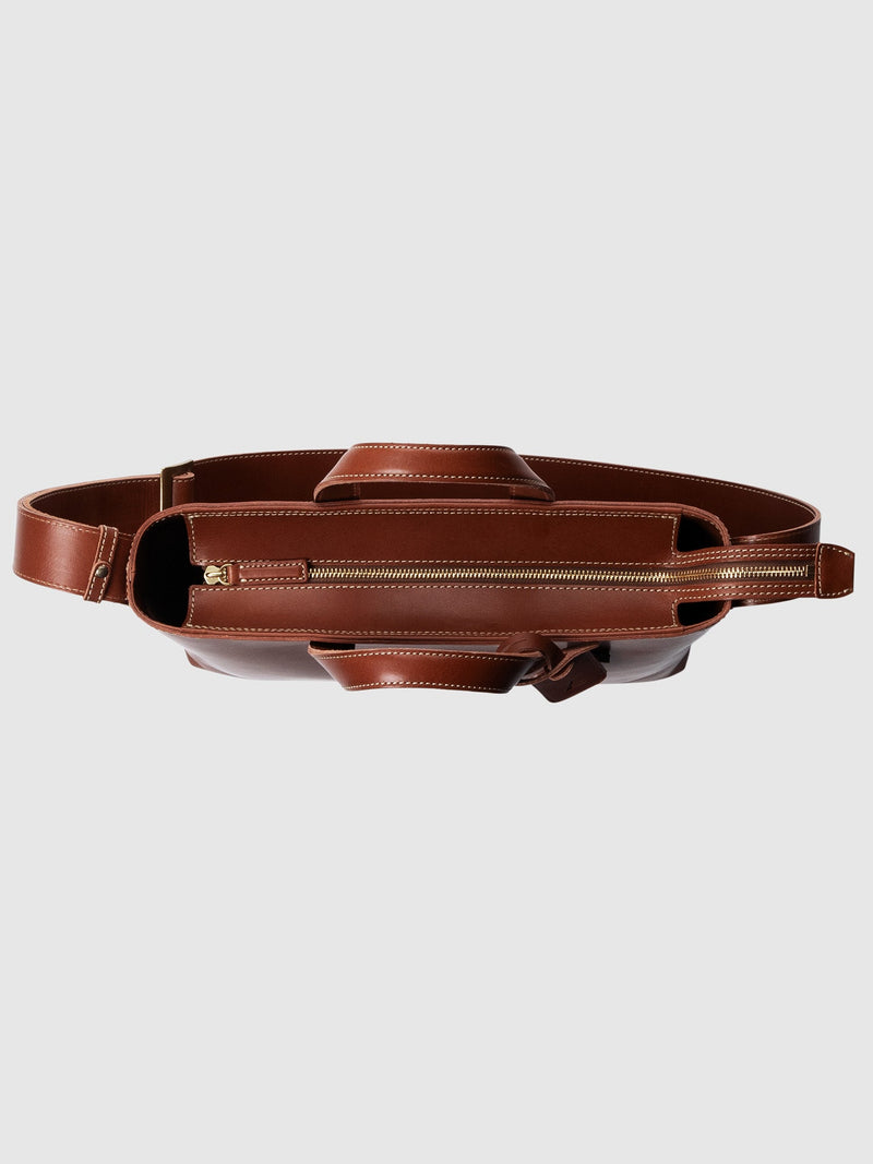 革は厚みがありながらも手触りが柔らかく、トップにはファスナーが付いているので中身が見える心配もなし、