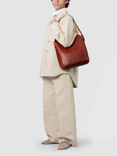 - Durable leather handles crafted to taper at the center for comfortable shoulder placement