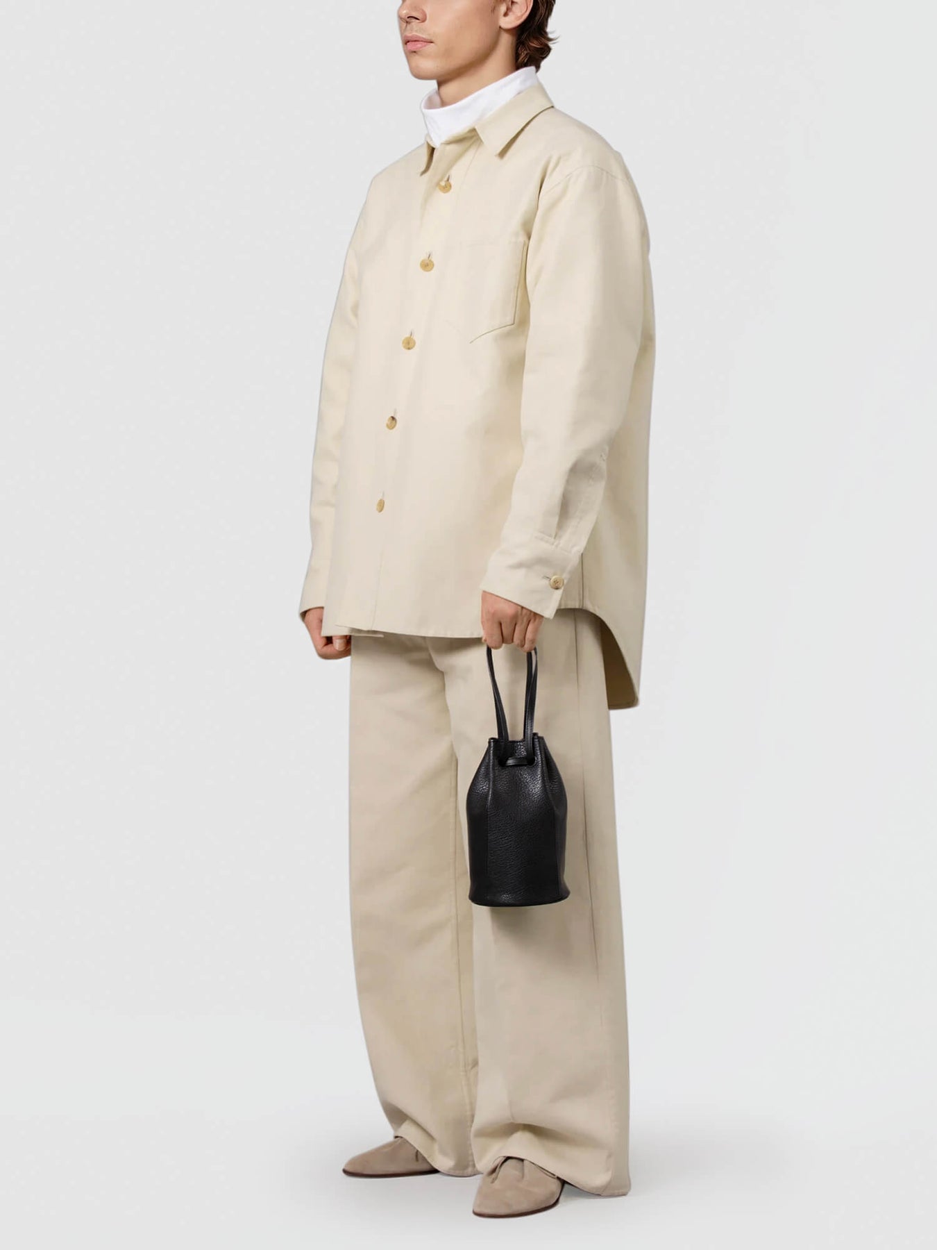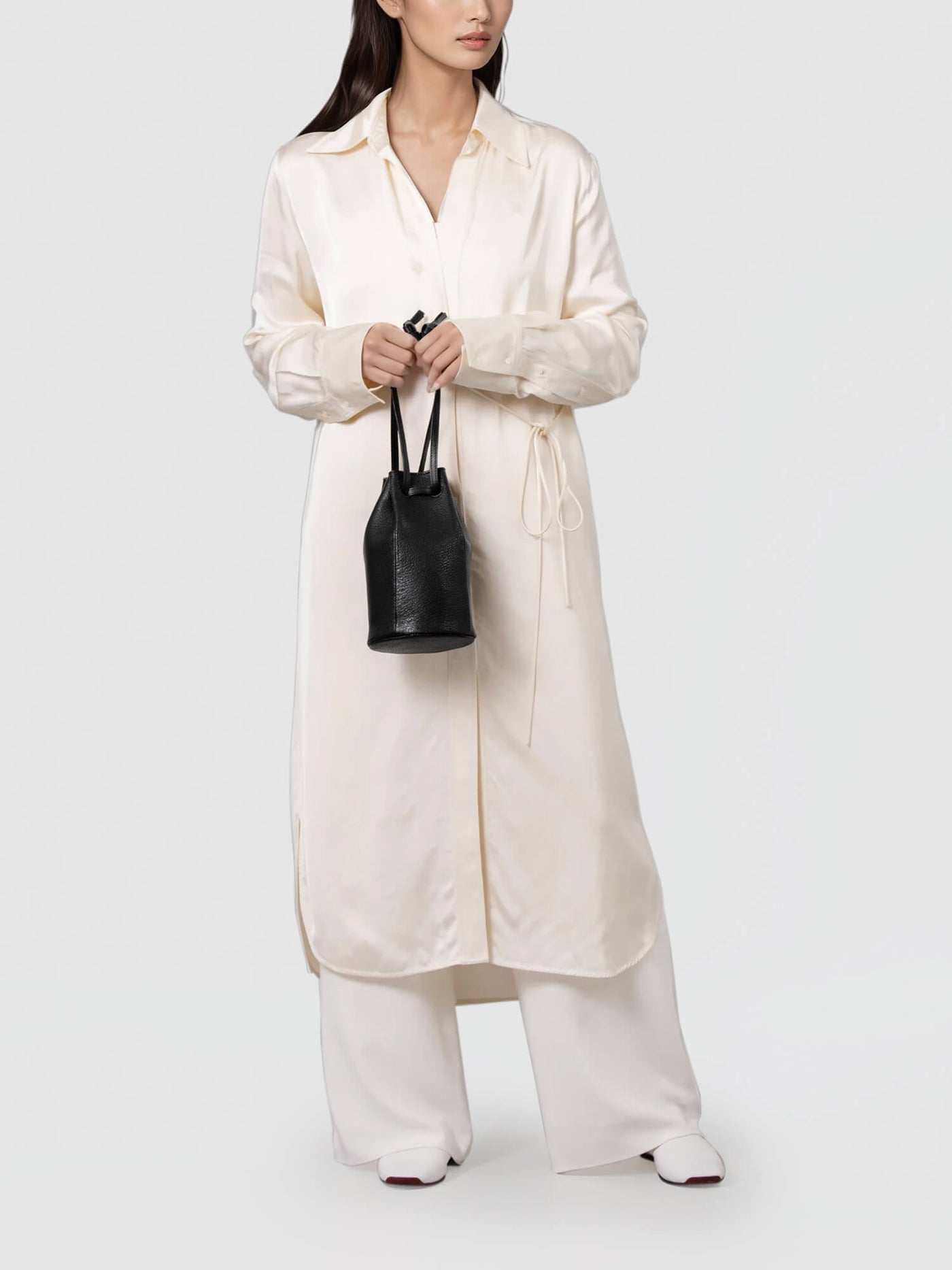 Discover Tsuchiya Kaban's Chari-Happo Collection, featuring our new Chari-Happo leather: a uniquely textured, hand-rolled leather dating back to the early Meiji era (late 1800's). This stylish round drawstring bag is based on the traditional Japanese Kinchaku bag, a compact yet chic favorite for carrying everyday essentials. The leather drawstrings are adorned with an elegant Myoga knot—a traditional Japanese knot symbolizing good fortune.- A minimalist, round drawstring bag featuring bold folds that highlight the exquisite texture of the Chari-Happo leather