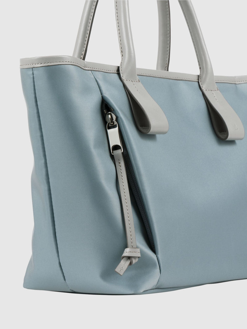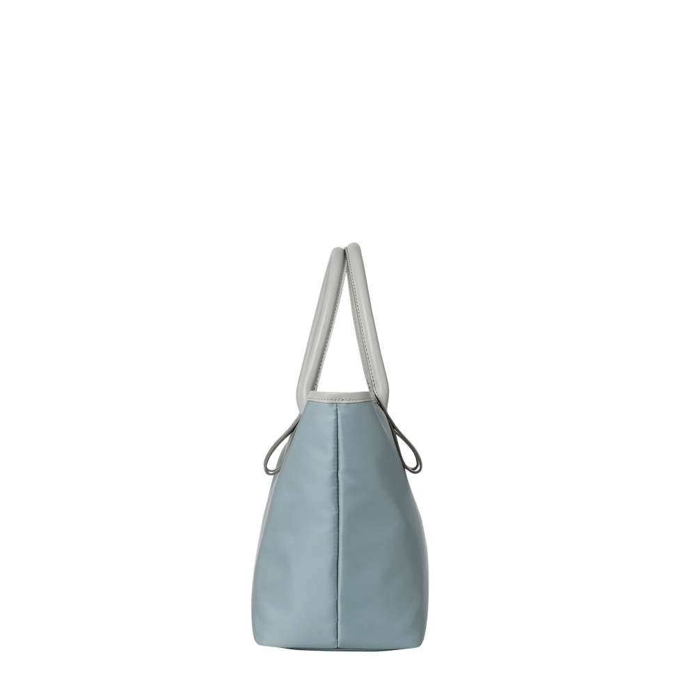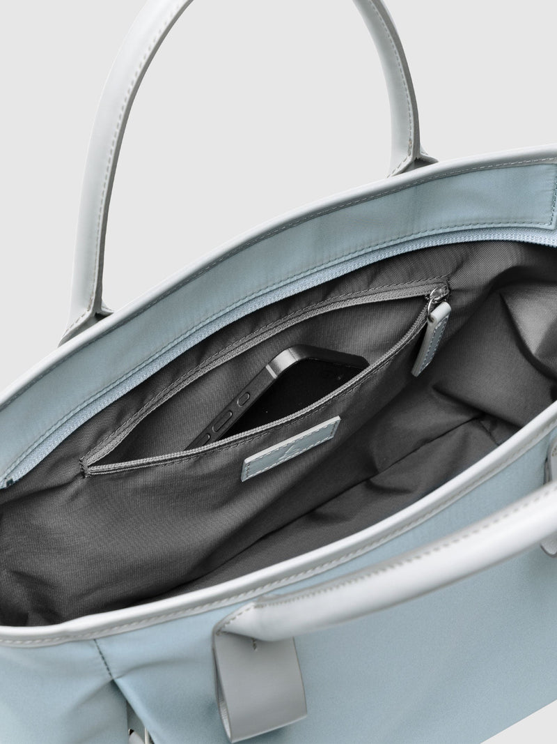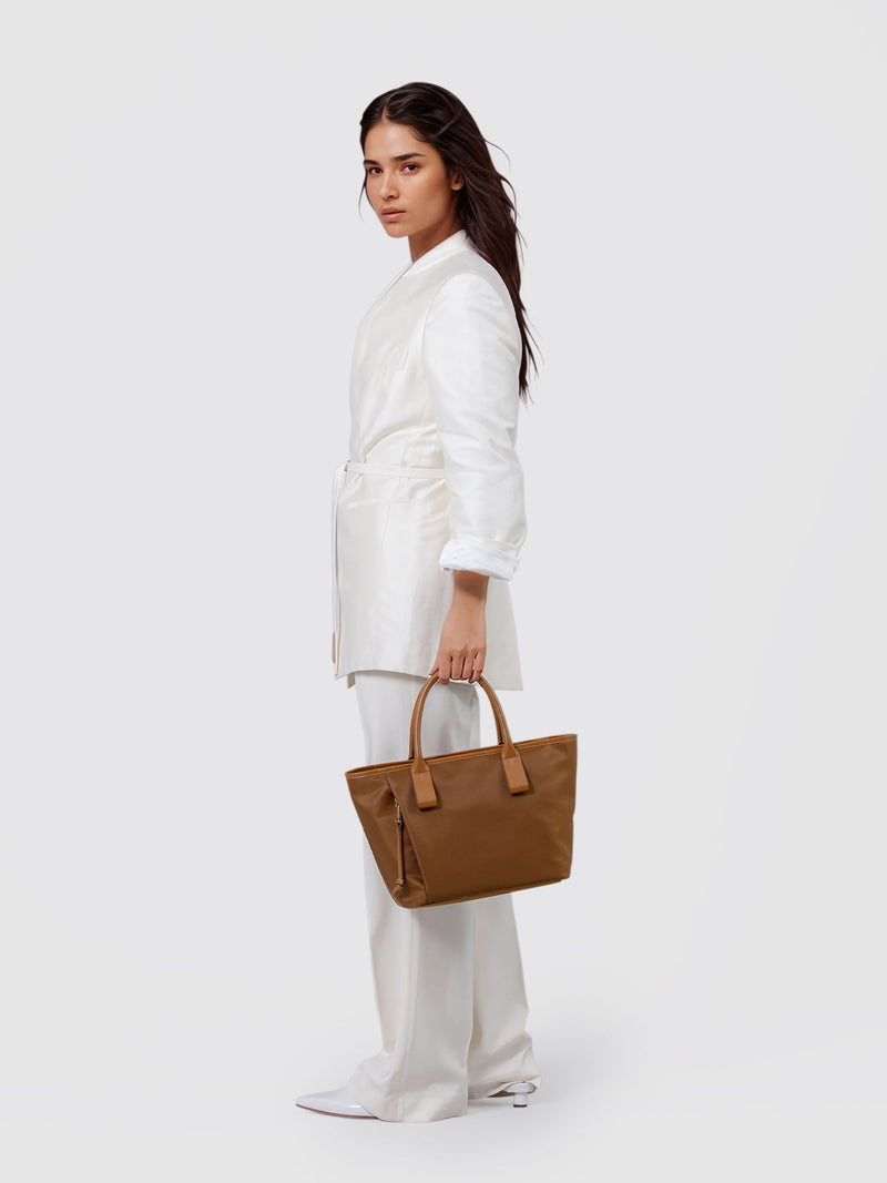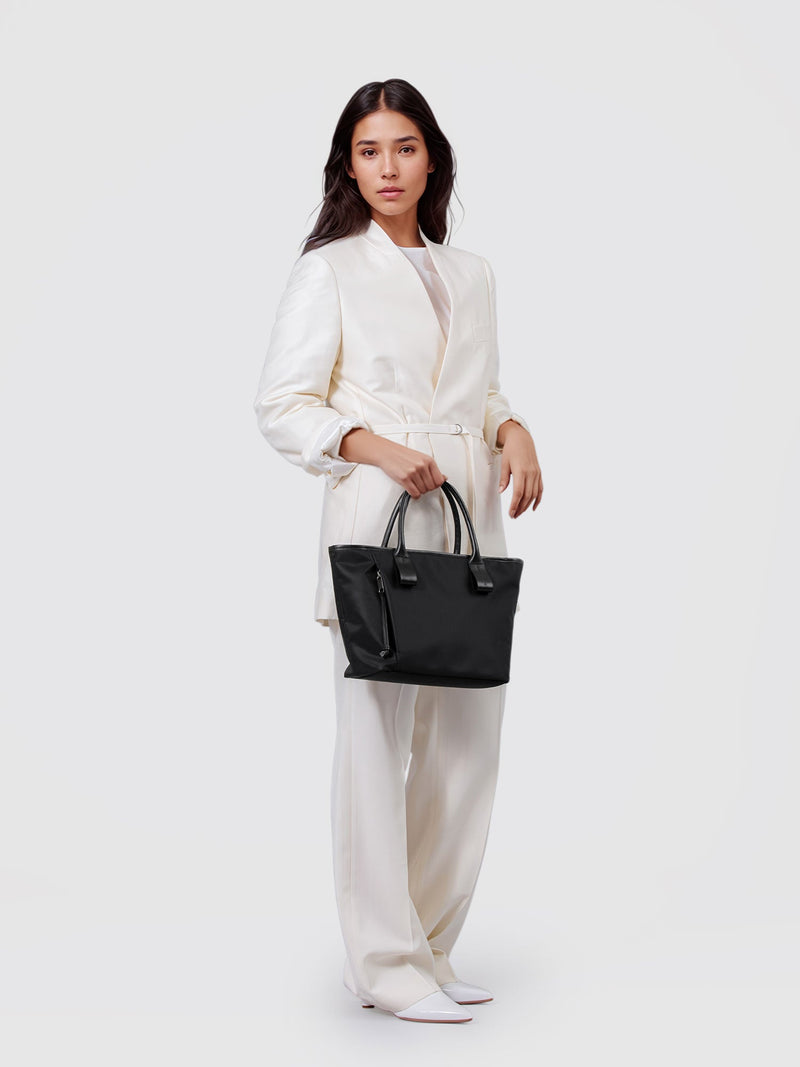 This small and lightweight nylon tote features a chic, semi-gloss texture and a minimalist design that seamlessly transitions from business to casual. With functional features and leather accents that provide both comfort and style, it brings effortless elegance to everyday scenes.