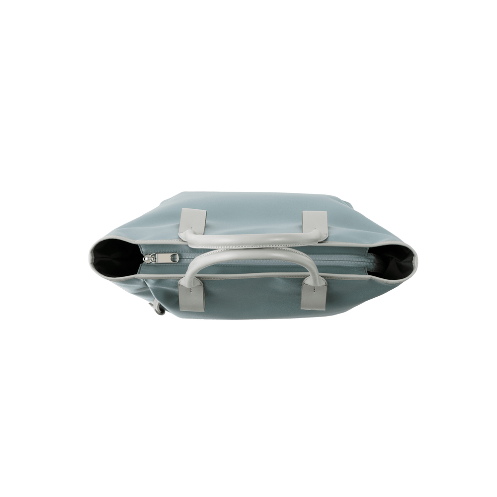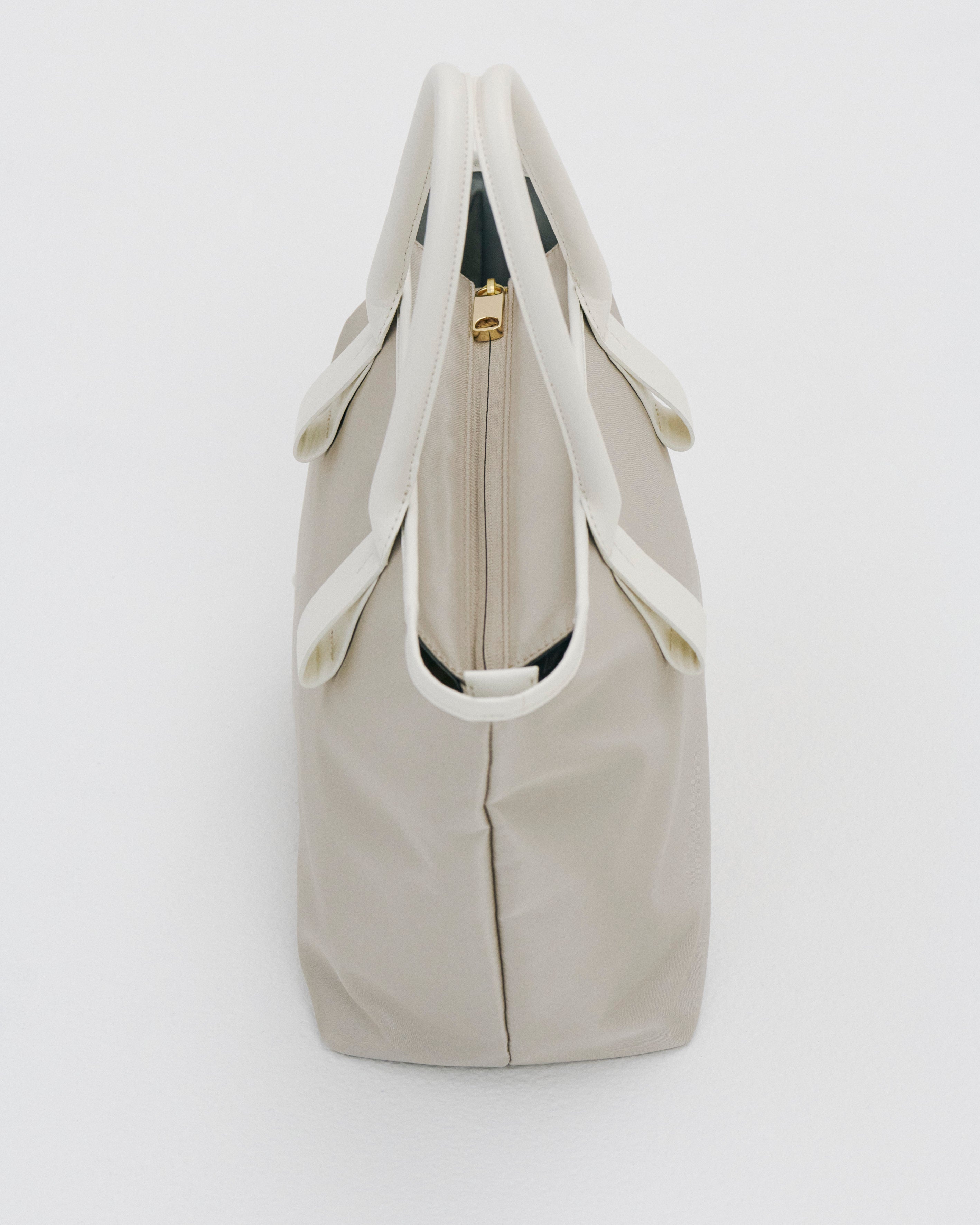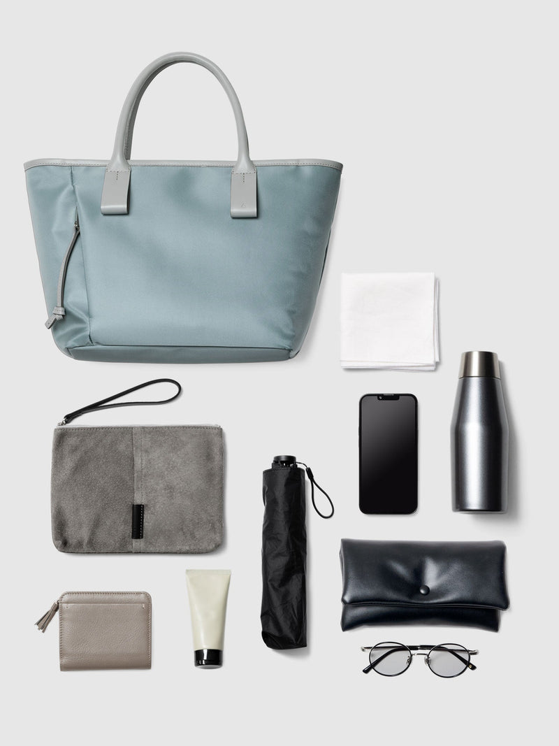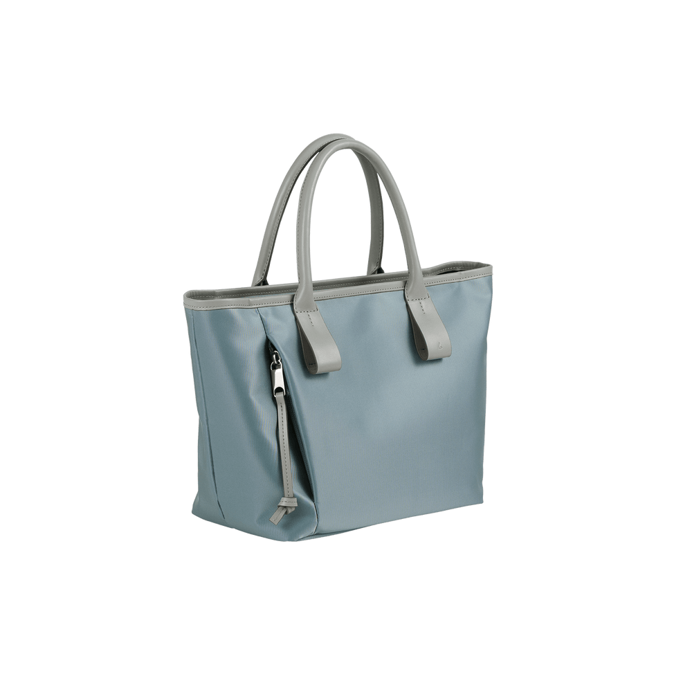 This small and lightweight nylon tote features a chic, semi-gloss texture and a minimalist design that seamlessly transitions from business to casual. With functional features and leather accents that provide both comfort and style, it brings effortless elegance to everyday scenes.