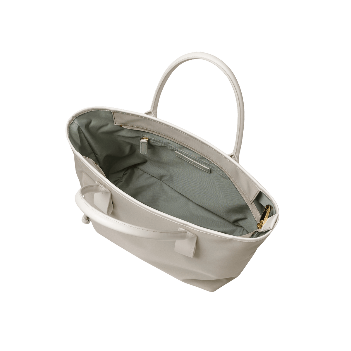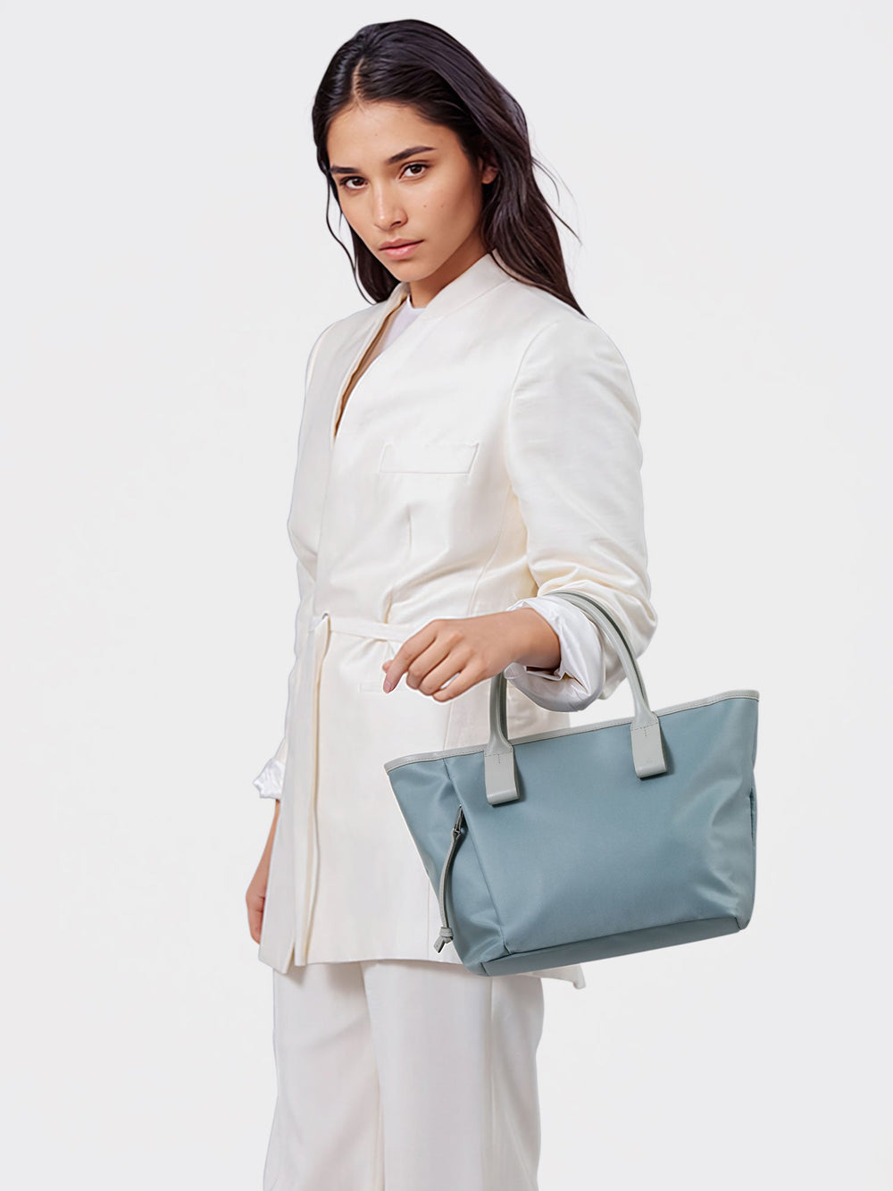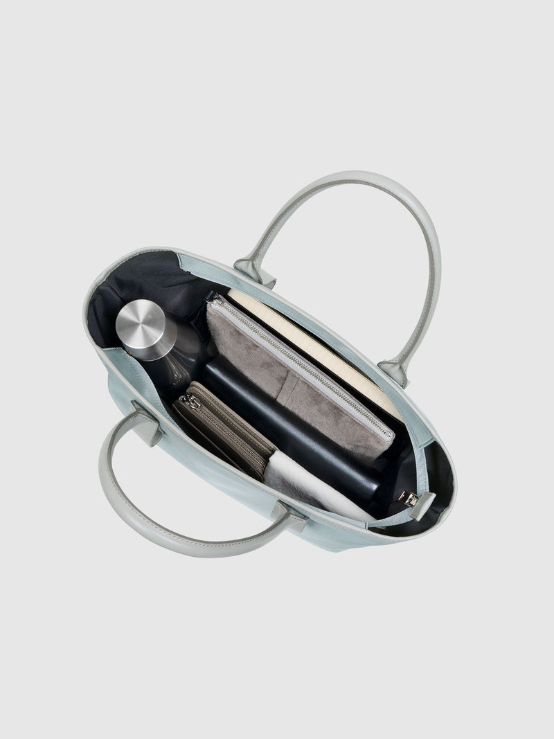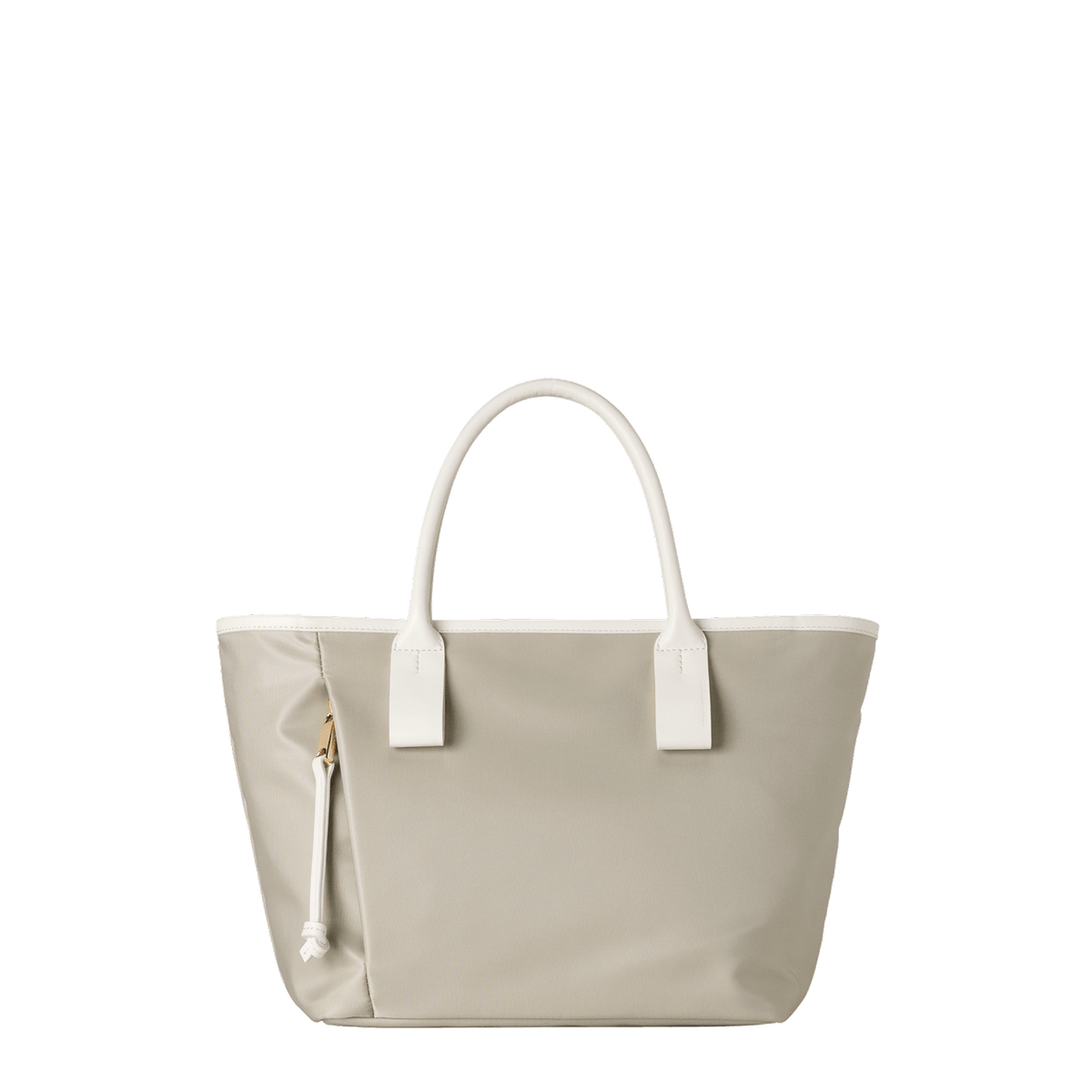 This small and lightweight nylon tote features a chic, semi-gloss texture and a minimalist design that seamlessly transitions from business to casual. With functional features and leather accents that provide both comfort and style, it brings effortless elegance to everyday scenes.