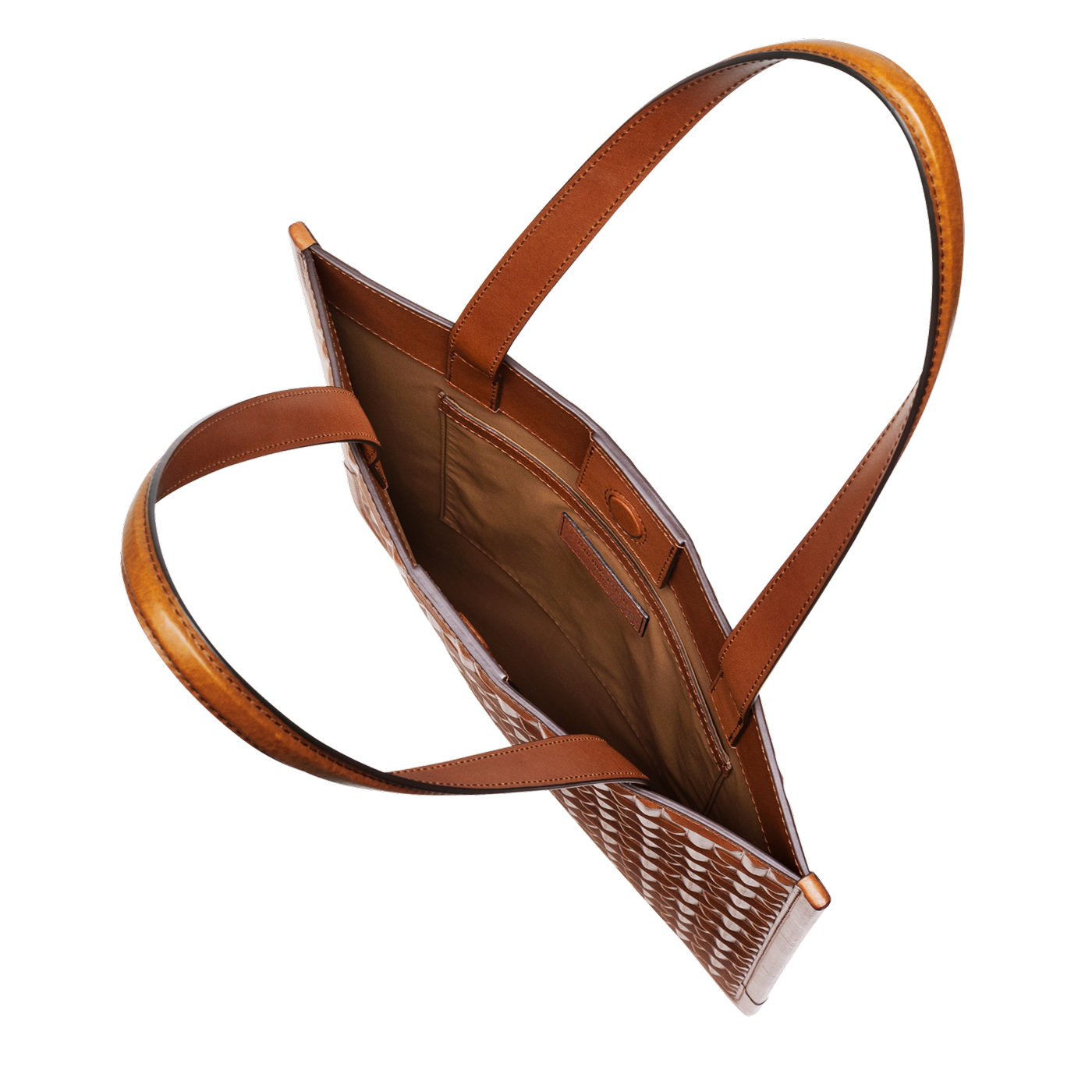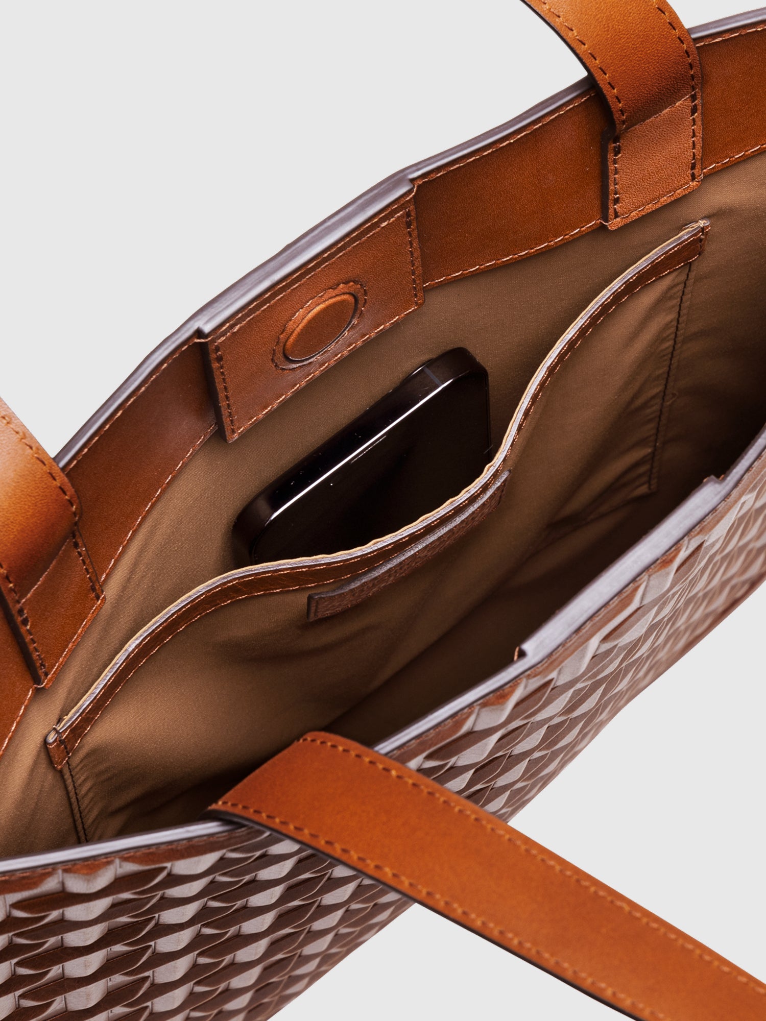 An elegant slim tote featuring exquisitely embossed premium Italian leather